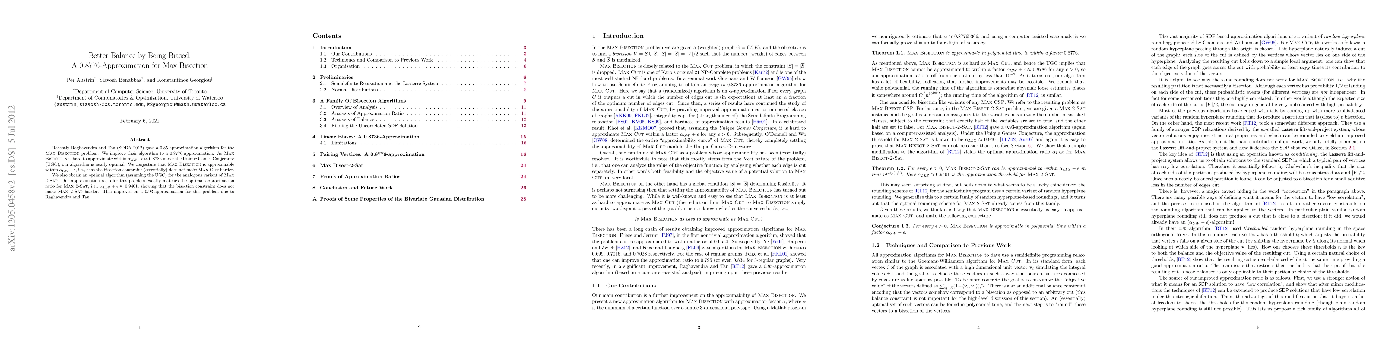 Recently Raghavendra and Tan (SODA 2012) gave a 0.85-approximation algorithm for the Max Bisection problem. We improve their algorithm to a 0.8776-approximation. As Max Bisection is hard to approximate within $\alpha_{GW} + \epsilon \approx 0.8786$ under the Unique Games Conjecture (UGC), our algorithm is nearly optimal. We conjecture that Max Bisection is approximable within $\alpha_{GW}-\epsilon$, i.e., the bisection constraint (essentially) does not make Max Cut harder. We also obtain an optimal algorithm (assuming the UGC) for the analogous variant of Max 2-Sat. Our approximation ratio for this problem exactly matches the optimal approximation ratio for Max 2-Sat, i.e., $\alpha_{LLZ} + \epsilon \approx 0.9401$, showing that the bisection constraint does not make Max 2-Sat harder. This improves on a 0.93-approximation for this problem due to Raghavendra and Tan.
