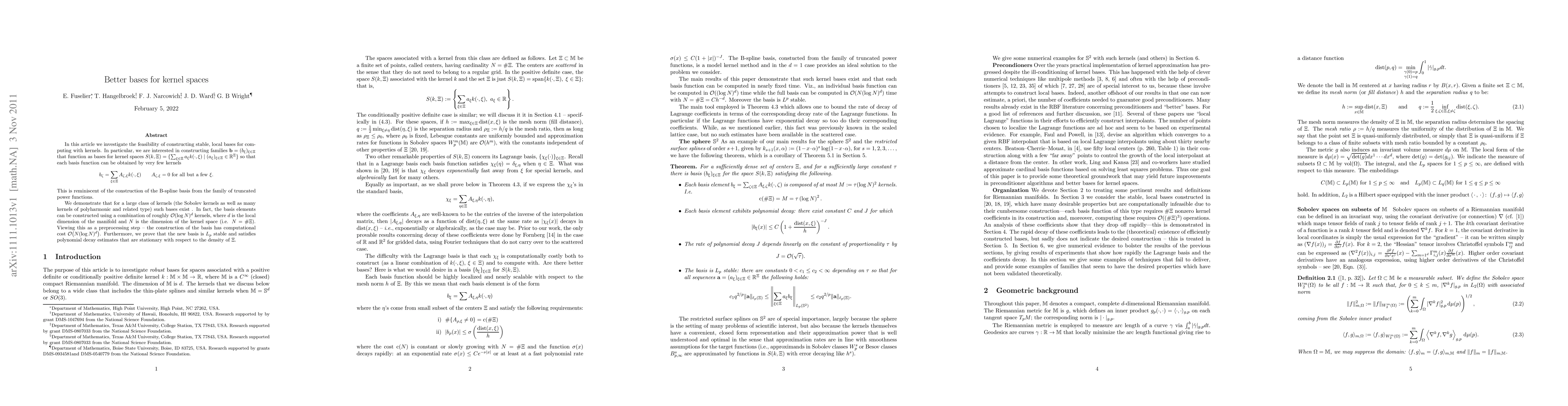 In this article we investigate the feasibility of constructing stable, local bases for computing with kernels. In particular, we are interested in constructing families $(b_{\xi})_{\xi\in\Xi}$ that function as bases for kernel spaces $S(k,\Xi)$ so that each basis function is constructed using very few kernels. In other words, each function $b_{\zeta}(x) = \sum_{\xi\in\Xi} A_{\zeta,\xi} k(x,\xi)$ is a linear combination of samples of the kernel with few nonzero coefficients $A_{\zeta,\xi}$. This is reminiscent of the construction of the B-spline basis from the family of truncated power functions. We demonstrate that for a large class of kernels (the Sobolev kernels as well as many kernels of polyharmonic and related type) such bases exist. In fact, the basis elements can be constructed using a combination of roughly $O(\log N)^d$ kernels, where $d$ is the local dimension of the manifold and $N$ is the dimension of the kernel space (i.e. $N=#\Xi$). Viewing this as a preprocessing step -- the construction of the basis has computational cost $O(N(\log N)^d)$. Furthermore, we prove that the new basis is $L_p$ stable and satisfies polynomial decay estimates that are stationary with respect to the density of $\Xi$.