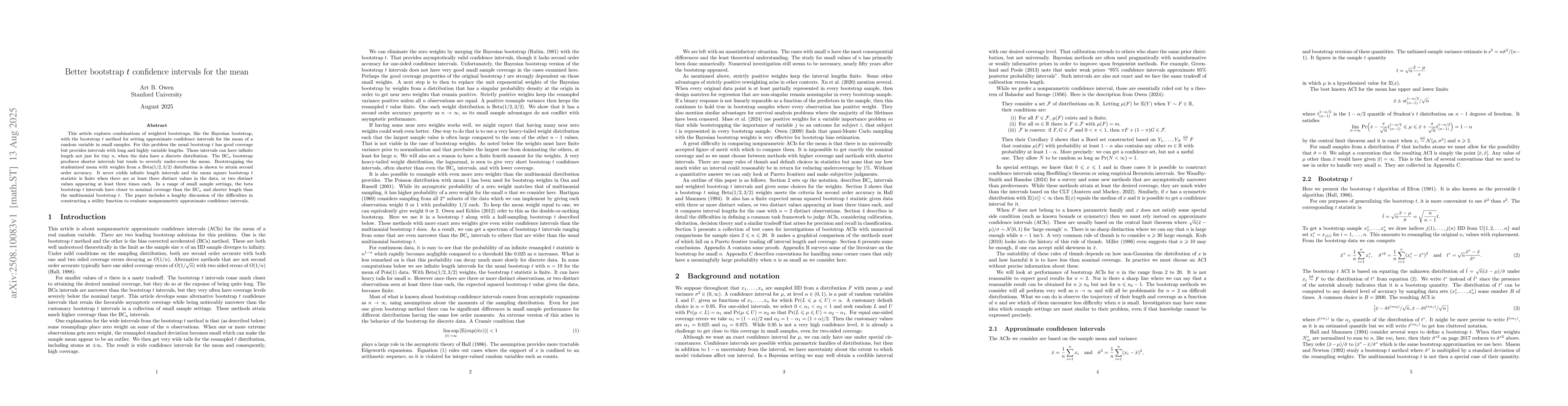 This article explores combinations of weighted bootstraps, like the Bayesian bootstrap, with the bootstrap $t$ method for setting approximate confidence intervals for the mean of a random variable in small samples. For this problem the usual bootstrap $t$ has good coverage but provides intervals with long and highly variable lengths. Those intervals can have infinite length not just for tiny $n$, when the data have a discrete distribution. The BC$_a$ bootstrap produces shorter intervals but tends to severely under-cover the mean. Bootstrapping the studentized mean with weights from a Beta$(1/2,3/2)$ distribution is shown to attain second order accuracy. It never yields infinite length intervals and the mean square bootstrap $t$ statistic is finite when there are at least three distinct values in the data, or two distinct values appearing at least three times each. In a range of small sample settings, the beta bootstrap $t$ intervals have closer to nominal coverage than the BC$_a$ and shorter length than the multinomial bootstrap $t$. The paper includes a lengthy discussion of the difficulties in constructing a utility function to evaluate nonparametric approximate confidence intervals.