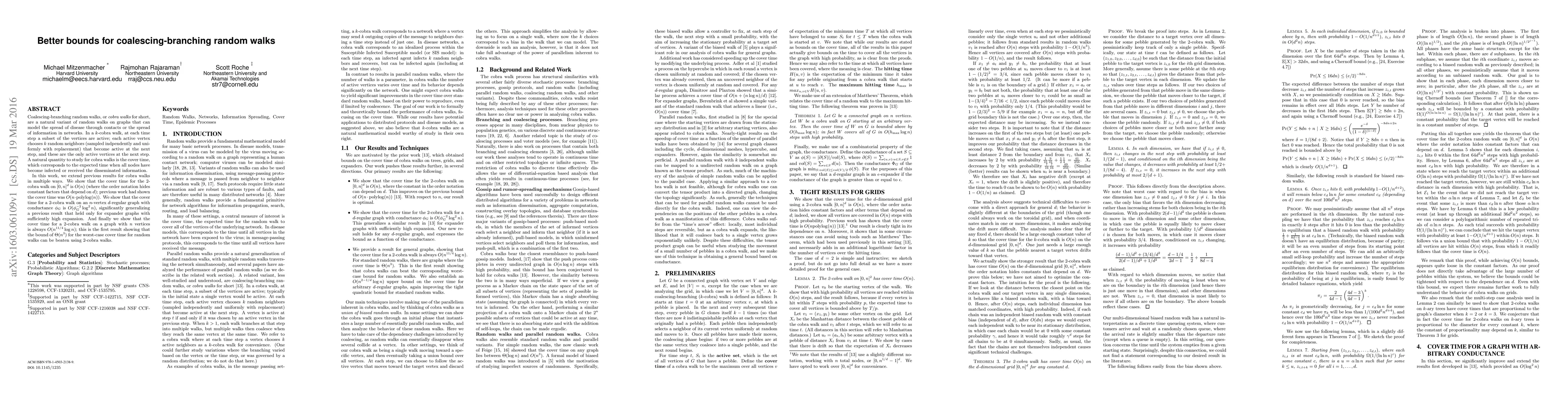The paper extends previous results for cobra walks by providing new bounds for their cover time on various graph structures, including d-dimensional grids, d-regular graphs with arbitrary conductance, and general graphs.