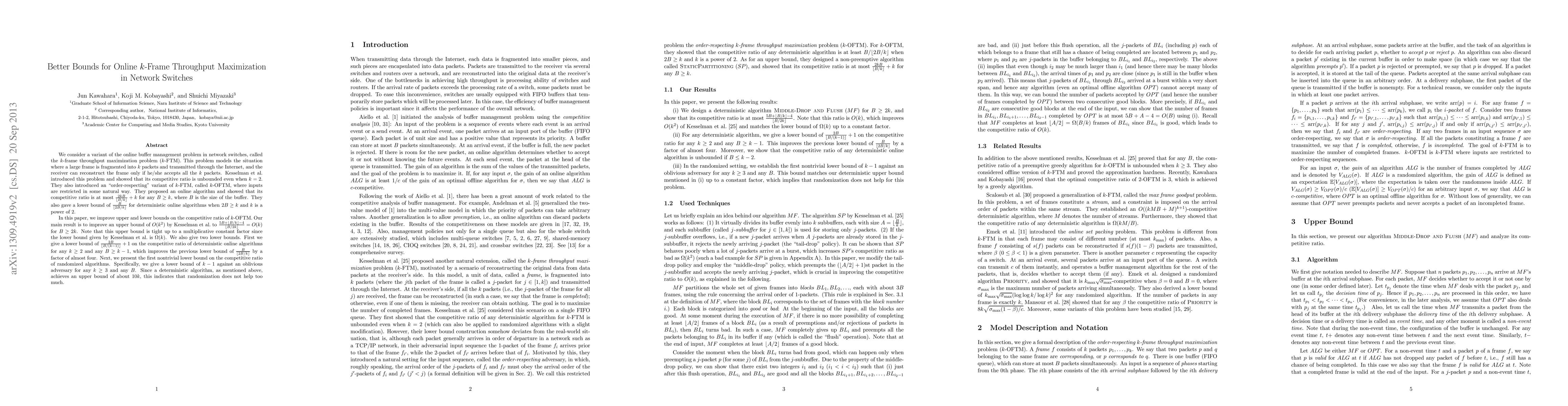 We consider a variant of the online buffer management problem in network switches, called the $k$-frame throughput maximization problem ($k$-FTM). This problem models the situation where a large frame is fragmented into $k$ packets and transmitted through the Internet, and the receiver can reconstruct the frame only if he/she accepts all the $k$ packets. Kesselman et al.\ introduced this problem and showed that its competitive ratio is unbounded even when $k=2$. They also introduced an "order-respecting" variant of $k$-FTM, called $k$-OFTM, where inputs are restricted in some natural way. They proposed an online algorithm and showed that its competitive ratio is at most $\frac{2kB}{\lfloor B/k \rfloor} + k$ for any $B \ge k$, where $B$ is the size of the buffer. They also gave a lower bound of $\frac{B}{\lfloor 2B/k \rfloor}$ for deterministic online algorithms when $2B \geq k$ and $k$ is a power of 2. In this paper, we improve upper and lower bounds on the competitive ratio of $k$-OFTM. Our main result is to improve an upper bound of $O(k^{2})$ by Kesselman et al.\ to $\frac{5B + \lfloor B/k \rfloor - 4}{\lfloor B/2k \rfloor} = O(k)$ for $B\geq 2k$. Note that this upper bound is tight up to a multiplicative constant factor since the lower bound given by Kesselman et al.\ is $\Omega(k)$. We also give two lower bounds. First we give a lower bound of $\frac{2B}{\lfloor {B/(k-1)} \rfloor} + 1$ on the competitive ratio of deterministic online algorithms for any $k \geq 2$ and any $B \geq k-1$, which improves the previous lower bound of $\frac{B}{\lfloor 2B/k \rfloor}$ by a factor of almost four. Next, we present the first nontrivial lower bound on the competitive ratio of randomized algorithms. Specifically, we give a lower bound of $k-1$ against an oblivious adversary for any $k \geq 3$ and any $B$.
