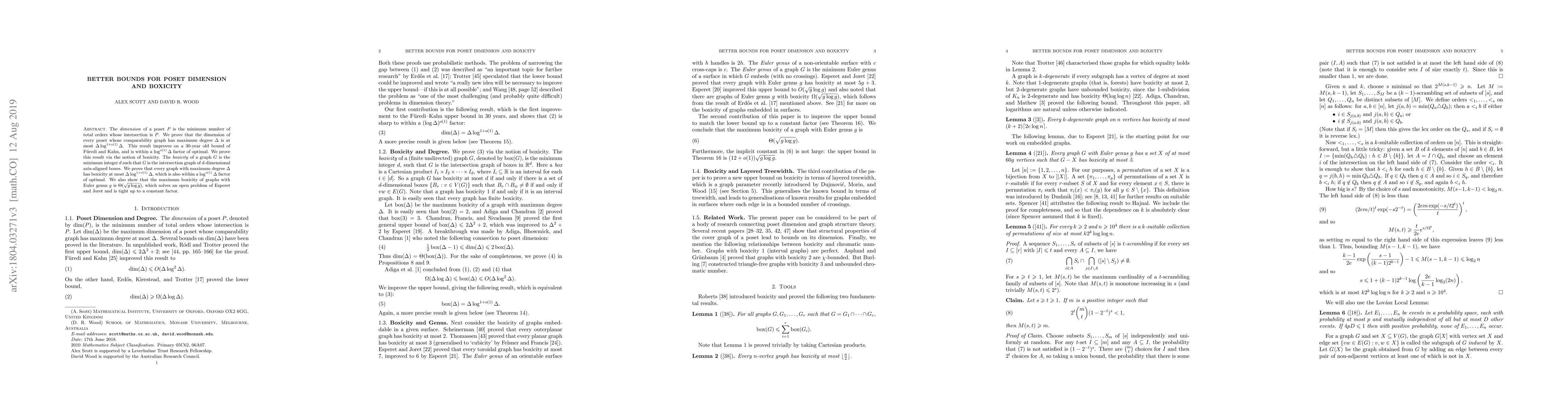 This paper improves the bound for poset dimension and boxicity, proving that the dimension of posets whose comparability graphs have maximum degree $\Delta$ is at most $\Delta\log^{1+o(1)} \Delta$, surpassing a 30-year-old bound. It also establishes that graphs with maximum degree $\Delta$ have boxicity at most $\Delta\log^{1+o(1)} \Delta$.