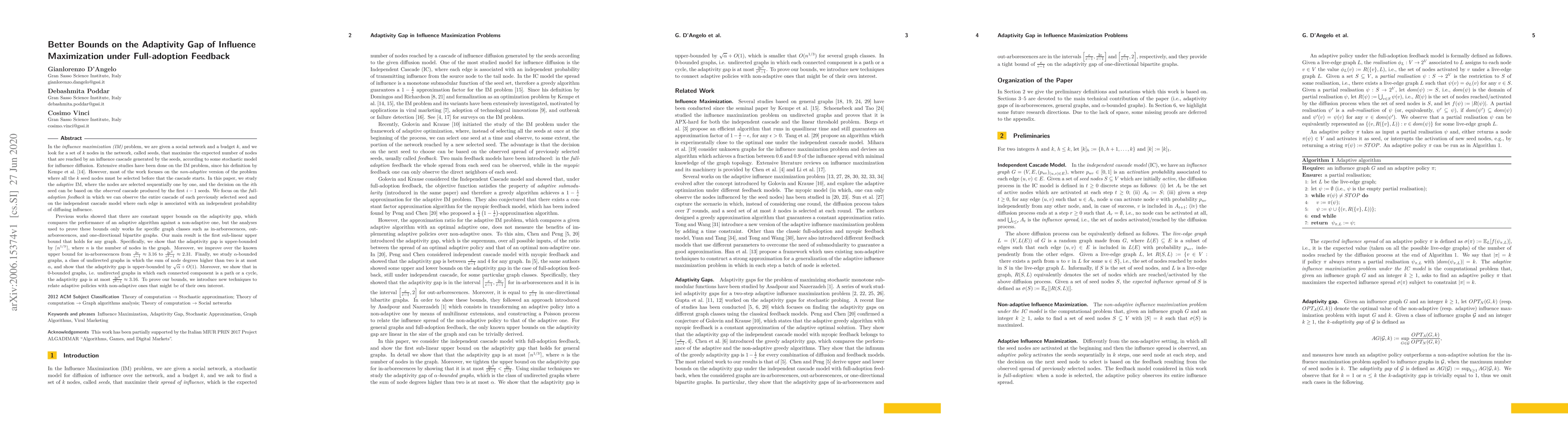 In the influence maximization (IM) problem, we are given a social network and a budget $k$, and we look for a set of $k$ nodes in the network, called seeds, that maximize the expected number of nodes that are reached by an influence cascade generated by the seeds, according to some stochastic model for influence diffusion. In this paper, we study the adaptive IM, where the nodes are selected sequentially one by one, and the decision on the $i$th seed can be based on the observed cascade produced by the first $i-1$ seeds. We focus on the full-adoption feedback in which we can observe the entire cascade of each previously selected seed and on the independent cascade model where each edge is associated with an independent probability of diffusing influence. Our main result is the first sub-linear upper bound that holds for any graph. Specifically, we show that the adaptivity gap is upper-bounded by $\lceil n^{1/3}\rceil $, where $n$ is the number of nodes in the graph. Moreover, we improve over the known upper bound for in-arborescences from $\frac{2e}{e-1}\approx 3.16$ to $\frac{2e^2}{e^2-1}\approx 2.31$. Finally, we study $\alpha$-bounded graphs, a class of undirected graphs in which the sum of node degrees higher than two is at most $\alpha$, and show that the adaptivity gap is upper-bounded by $\sqrt{\alpha}+O(1)$. Moreover, we show that in 0-bounded graphs, i.e. undirected graphs in which each connected component is a path or a cycle, the adaptivity gap is at most $\frac{3e^3}{e^3-1}\approx 3.16$. To prove our bounds, we introduce new techniques to relate adaptive policies with non-adaptive ones that might be of their own interest.