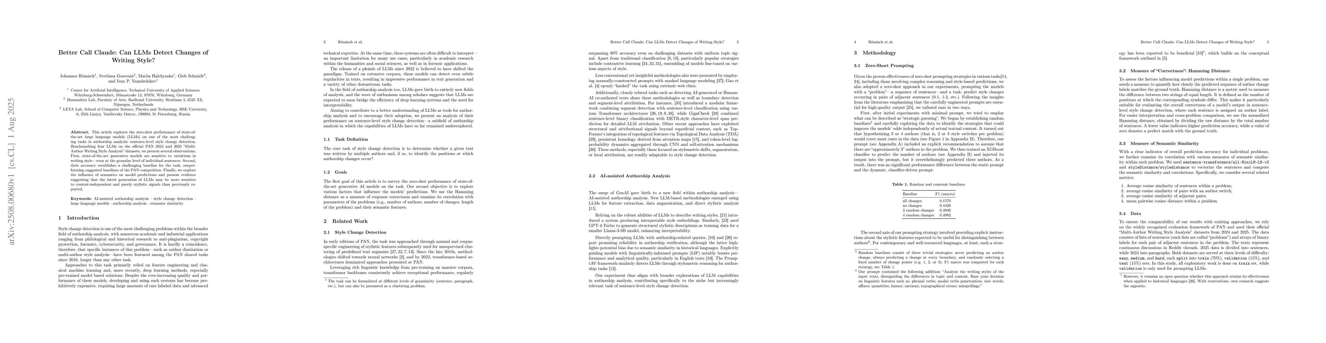 This article explores the zero-shot performance of state-of-the-art large language models (LLMs) on one of the most challenging tasks in authorship analysis: sentence-level style change detection. Benchmarking four LLMs on the official PAN~2024 and 2025 "Multi-Author Writing Style Analysis" datasets, we present several observations. First, state-of-the-art generative models are sensitive to variations in writing style - even at the granular level of individual sentences. Second, their accuracy establishes a challenging baseline for the task, outperforming suggested baselines of the PAN competition. Finally, we explore the influence of semantics on model predictions and present evidence suggesting that the latest generation of LLMs may be more sensitive to content-independent and purely stylistic signals than previously reported.