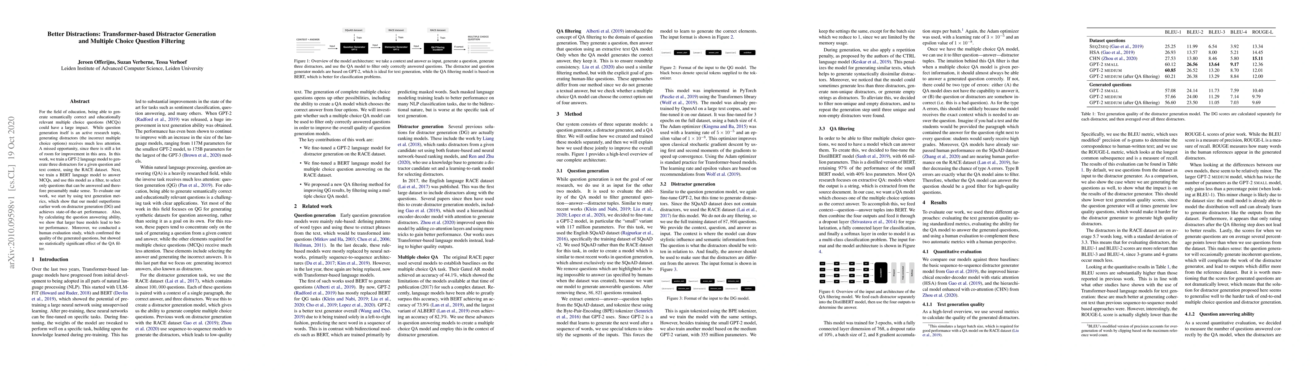This paper presents a method to generate semantically correct and educationally relevant distractors for multiple choice questions using a GPT-2 model, and filters them with a BERT model for better quality. The approach achieves state-of-the-art performance in distractor generation and question answering.