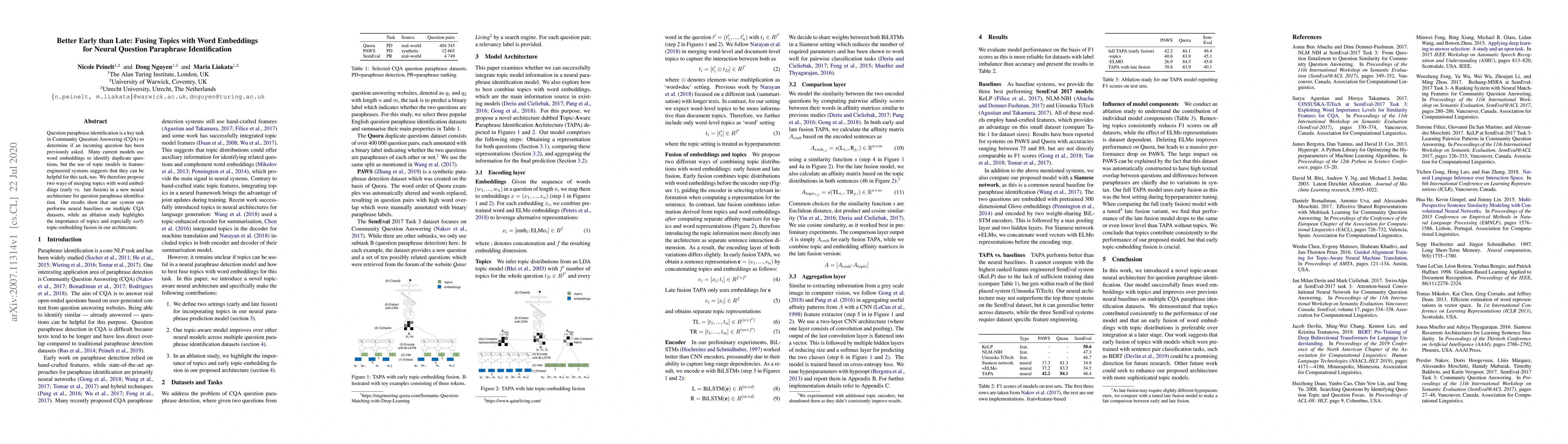 This paper proposes a neural architecture for question paraphrase identification that fuses topics with word embeddings either early or late in the model. The results demonstrate superior performance over neural baselines, with an emphasis on the effectiveness of early fusion of topics and word embeddings.