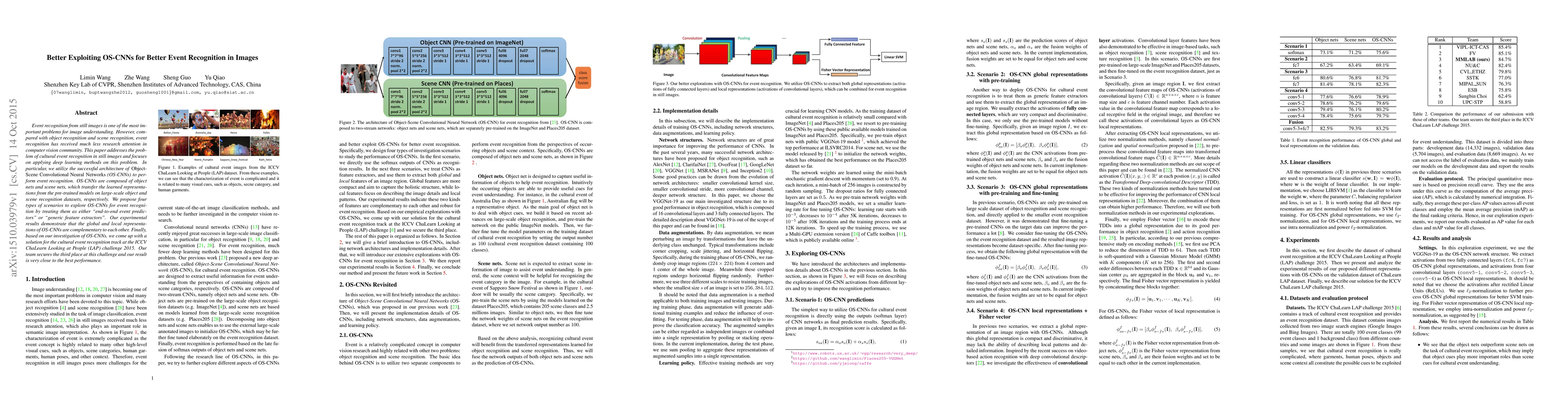 This paper explores enhancing Object-Scene Convolutional Neural Networks (OS-CNNs) for event recognition in still images, proposing four scenarios to leverage OS-CNNs' global and local representations. The study achieves third place in the ICCV ChaLearn Looking at People 2015 challenge, demonstrating the effectiveness of OS-CNNs for cultural event recognition.