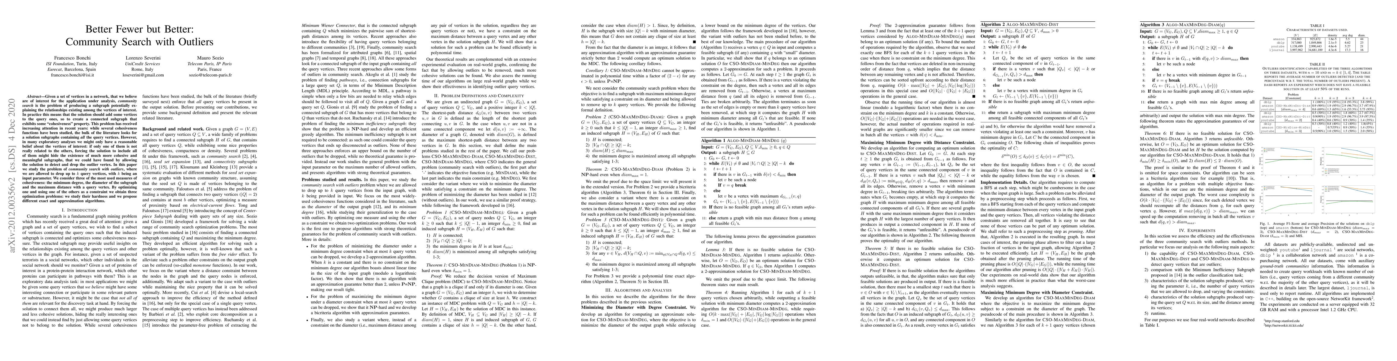 This paper introduces the problem of community search with outliers in network analysis, allowing the removal of up to k query vertices to find more cohesive subgraphs. It studies three cohesiveness measures, formulating optimization problems, and proposes exact and approximation algorithms, examining their complexity.