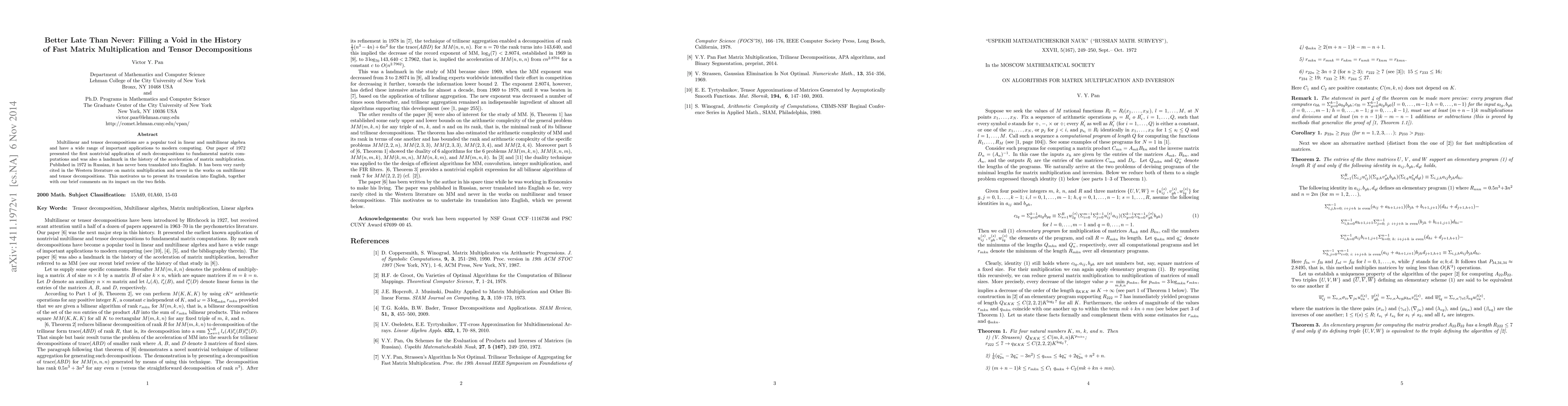 This paper presents the English translation of a 1972 Russian work that first applied multilinear and tensor decompositions to accelerate matrix multiplication, marking a significant milestone in the field. The translation aims to highlight its overlooked contributions to both matrix computation and tensor decompositions.