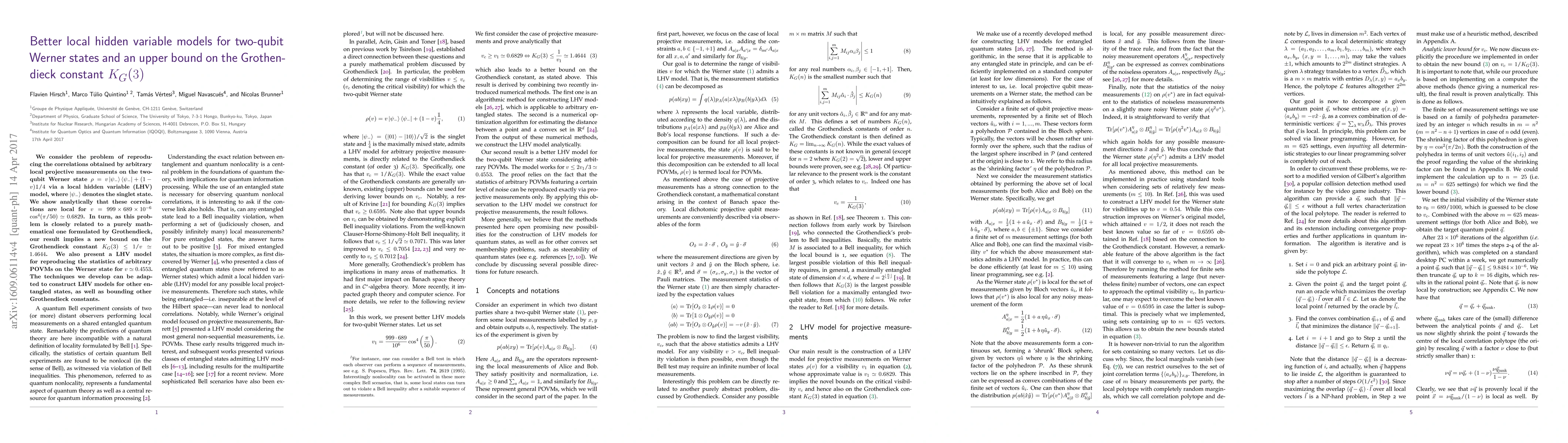 We consider the problem of reproducing the correlations obtained by arbitrary local projective measurements on the two-qubit Werner state $\rho = v |\psi_- > <\psi_- | + (1- v ) \frac{1}{4}$ via a local hidden variable (LHV) model, where $|\psi_- >$ denotes the singlet state. We show analytically that these correlations are local for $ v = 999\times689\times{10^{-6}}$ $\cos^4(\pi/50) \simeq 0.6829$. In turn, as this problem is closely related to a purely mathematical one formulated by Grothendieck, our result implies a new bound on the Grothendieck constant $K_G(3) \leq 1/v \simeq 1.4644$. We also present a LHV model for reproducing the statistics of arbitrary POVMs on the Werner state for $v \simeq 0.4553$. The techniques we develop can be adapted to construct LHV models for other entangled states, as well as bounding other Grothendieck constants.
