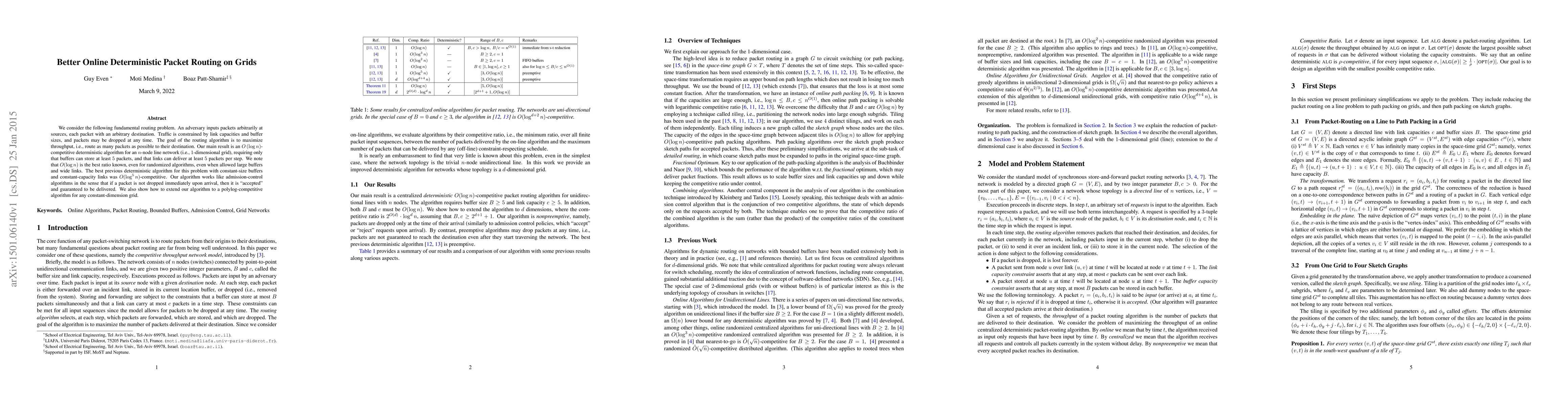 We consider the following fundamental routing problem. An adversary inputs packets arbitrarily at sources, each packet with an arbitrary destination. Traffic is constrained by link capacities and buffer sizes, and packets may be dropped at any time. The goal of the routing algorithm is to maximize throughput, i.e., route as many packets as possible to their destination. Our main result is an $O\left(\log n\right)$-competitive deterministic algorithm for an $n$-node line network (i.e., $1$-dimensional grid), requiring only that buffers can store at least $5$ packets, and that links can deliver at least $5$ packets per step. We note that $O(\log n)$ is the best ratio known, even for randomized algorithms, even when allowed large buffers and wide links. The best previous deterministic algorithm for this problem with constant-size buffers and constant-capacity links was $O(\log^5 n)$-competitive. Our algorithm works like admission-control algorithms in the sense that if a packet is not dropped immediately upon arrival, then it is "accepted" and guaranteed to be delivered. We also show how to extend our algorithm to a polylog-competitive algorithm for any constant-dimension grid.