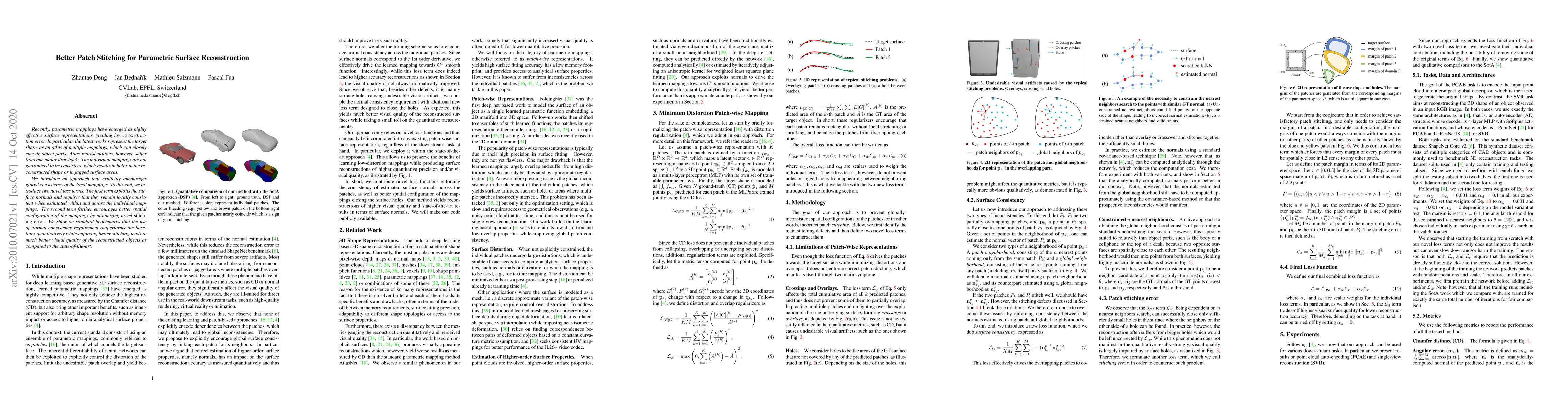 This paper proposes a method to improve parametric surface reconstruction by ensuring global consistency of local mappings through two novel loss terms: one that maintains local surface normal consistency and another that minimizes stitching error, resulting in both quantitatively better reconstruction error and visually superior quality compared to existing approaches.