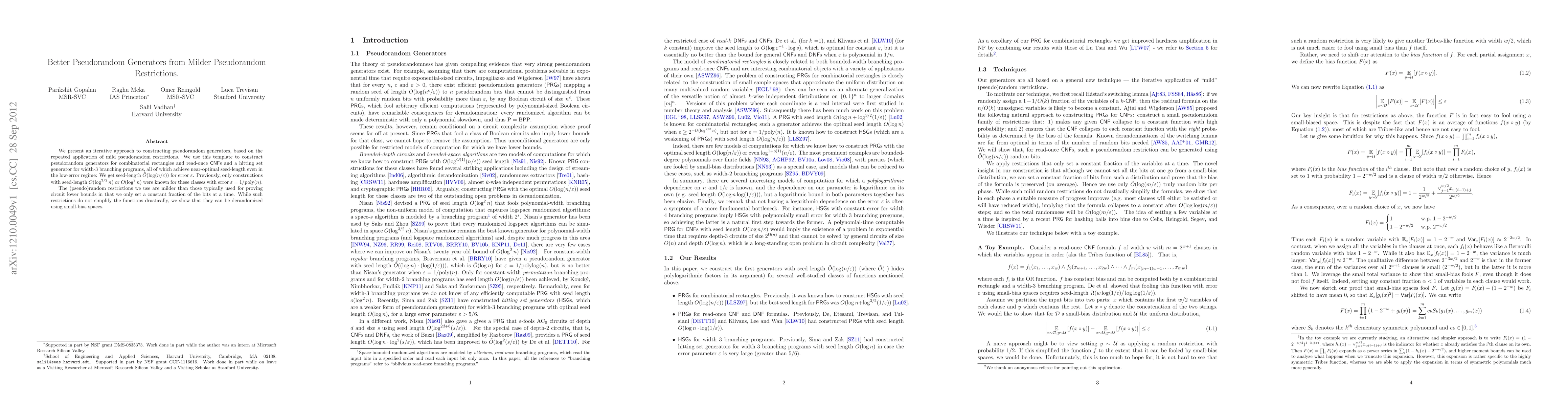 This paper introduces an iterative method for constructing pseudorandom generators using mild pseudorandom restrictions, achieving near-optimal seed-lengths of O(log (n/epsilon)) for combinatorial rectangles, read-once CNFs, and width-3 branching programs, outperforming previous constructions with higher seed-lengths. The method employs small-bias spaces to derandomize these restrictions effectively.