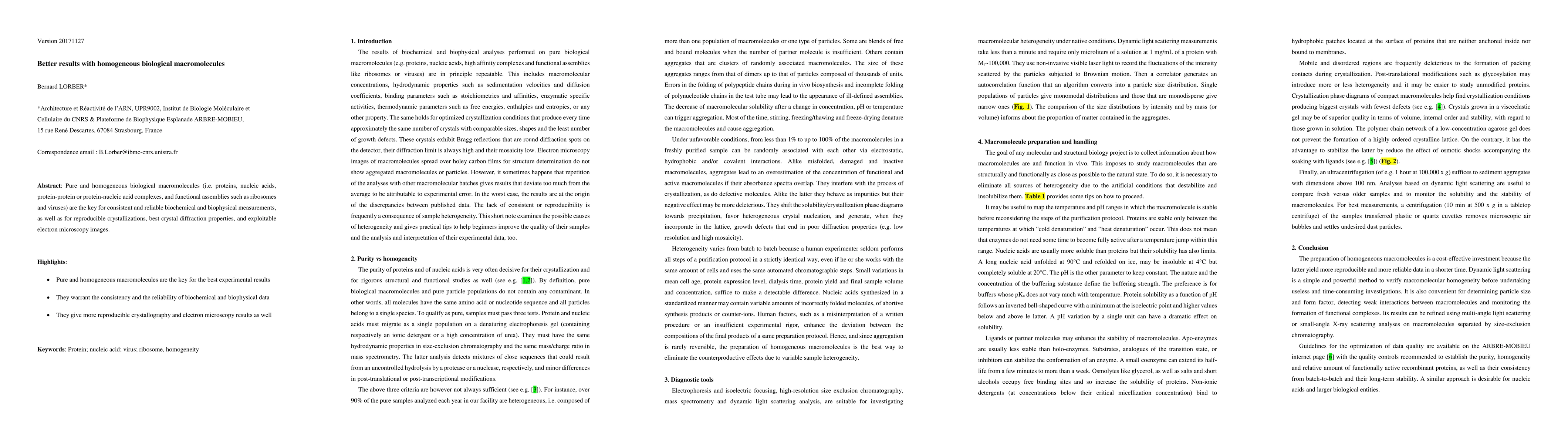 Pure and homogeneous biological macromolecules (i.e. proteins, nucleic acids, protein-protein or protein-nucleic acid complexes, and functional assemblies such as ribosomes and viruses) are the key for consistent and reliable biochemical and biophysical measurements, as well as for reproducible crystallizations, best crystal diffraction properties, and exploitable electron microscopy images. Highlights: Pure and homogeneous macromolecules are the key for the best experimental results; They warrant the consistency and the reliability of biochemical and biophysical data; They give more reproducible crystallography and electron microscopy results as well.