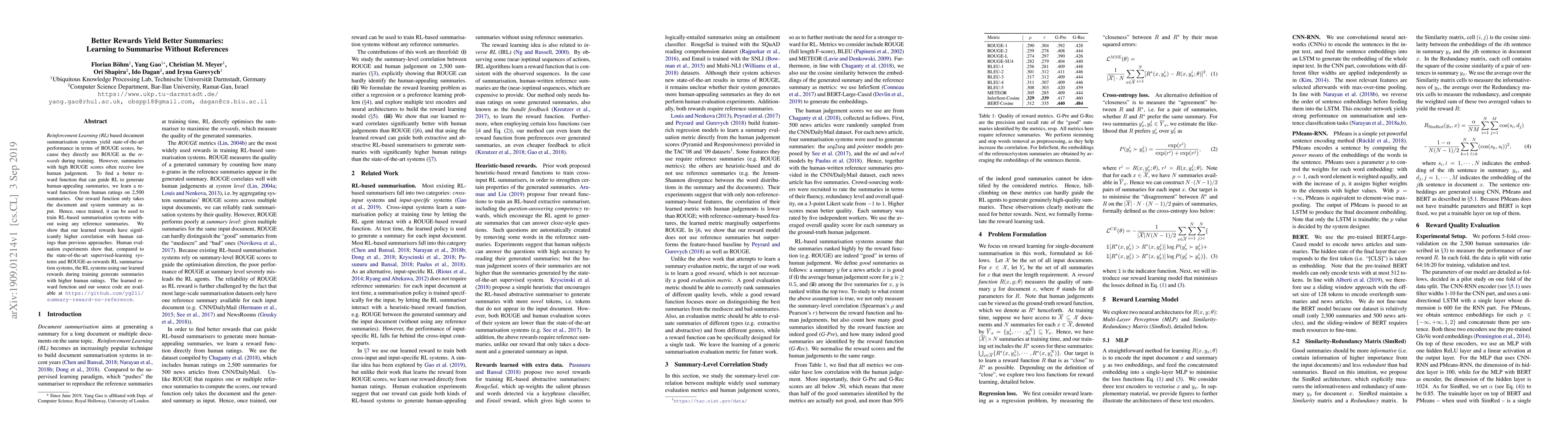 Reinforcement Learning (RL) based document summarisation systems yield state-of-the-art performance in terms of ROUGE scores, because they directly use ROUGE as the rewards during training. However, summaries with high ROUGE scores often receive low human judgement. To find a better reward function that can guide RL to generate human-appealing summaries, we learn a reward function from human ratings on 2,500 summaries. Our reward function only takes the document and system summary as input. Hence, once trained, it can be used to train RL-based summarisation systems without using any reference summaries. We show that our learned rewards have significantly higher correlation with human ratings than previous approaches. Human evaluation experiments show that, compared to the state-of-the-art supervised-learning systems and ROUGE-as-rewards RL summarisation systems, the RL systems using our learned rewards during training generate summarieswith higher human ratings. The learned reward function and our source code are available at https://github.com/yg211/summary-reward-no-reference.