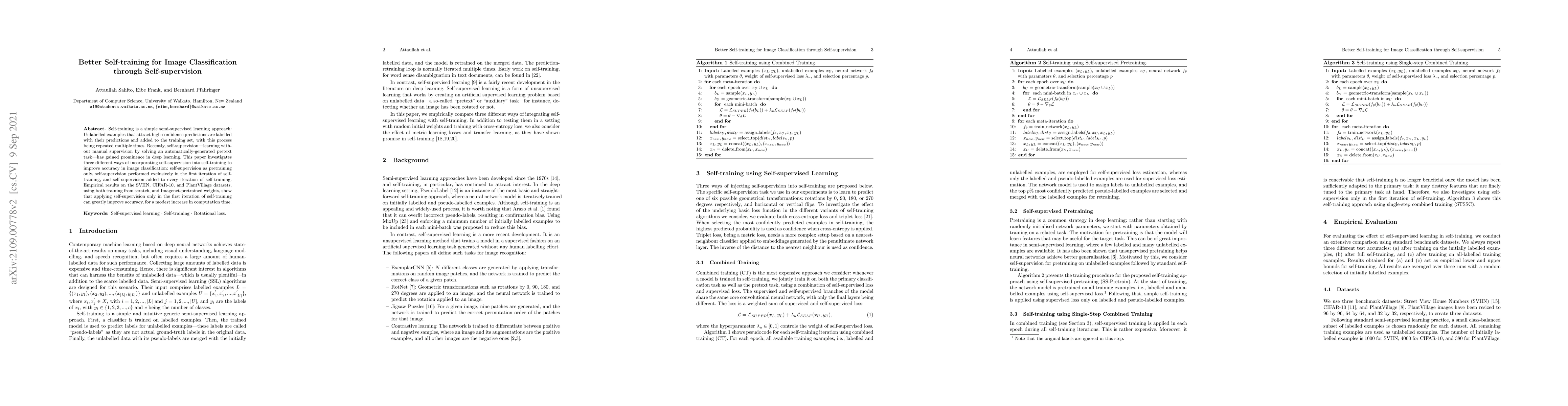 Self-training is a simple semi-supervised learning approach: Unlabelled examples that attract high-confidence predictions are labelled with their predictions and added to the training set, with this process being repeated multiple times. Recently, self-supervision -- learning without manual supervision by solving an automatically-generated pretext task -- has gained prominence in deep learning. This paper investigates three different ways of incorporating self-supervision into self-training to improve accuracy in image classification: self-supervision as pretraining only, self-supervision performed exclusively in the first iteration of self-training, and self-supervision added to every iteration of self-training. Empirical results on the SVHN, CIFAR-10, and PlantVillage datasets, using both training from scratch, and Imagenet-pretrained weights, show that applying self-supervision only in the first iteration of self-training can greatly improve accuracy, for a modest increase in computation time.