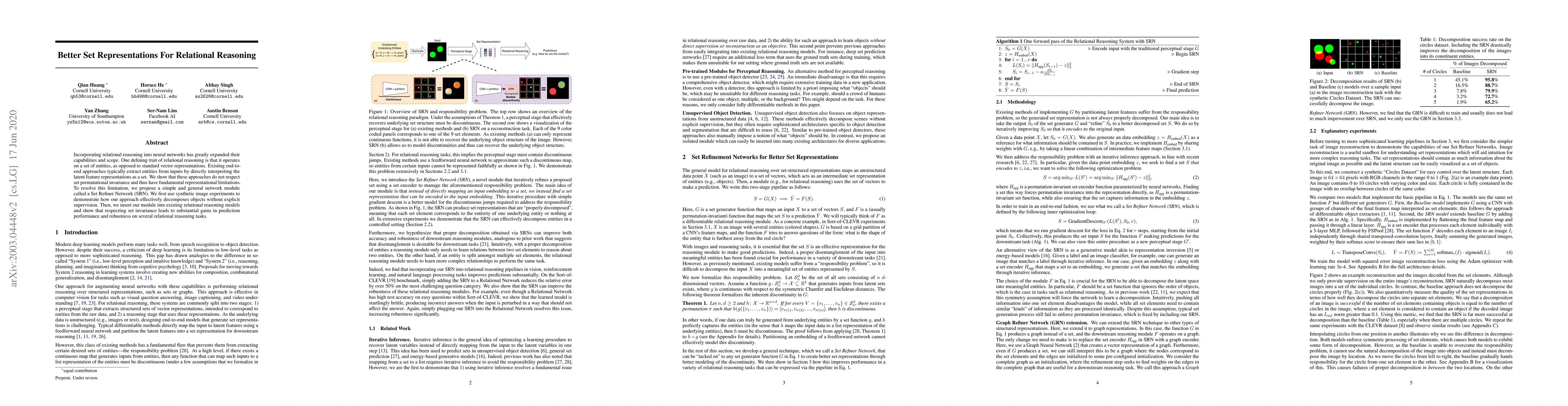 Incorporating relational reasoning into neural networks has greatly expanded their capabilities and scope. One defining trait of relational reasoning is that it operates on a set of entities, as opposed to standard vector representations. Existing end-to-end approaches typically extract entities from inputs by directly interpreting the latent feature representations as a set. We show that these approaches do not respect set permutational invariance and thus have fundamental representational limitations. To resolve this limitation, we propose a simple and general network module called a Set Refiner Network (SRN). We first use synthetic image experiments to demonstrate how our approach effectively decomposes objects without explicit supervision. Then, we insert our module into existing relational reasoning models and show that respecting set invariance leads to substantial gains in prediction performance and robustness on several relational reasoning tasks.