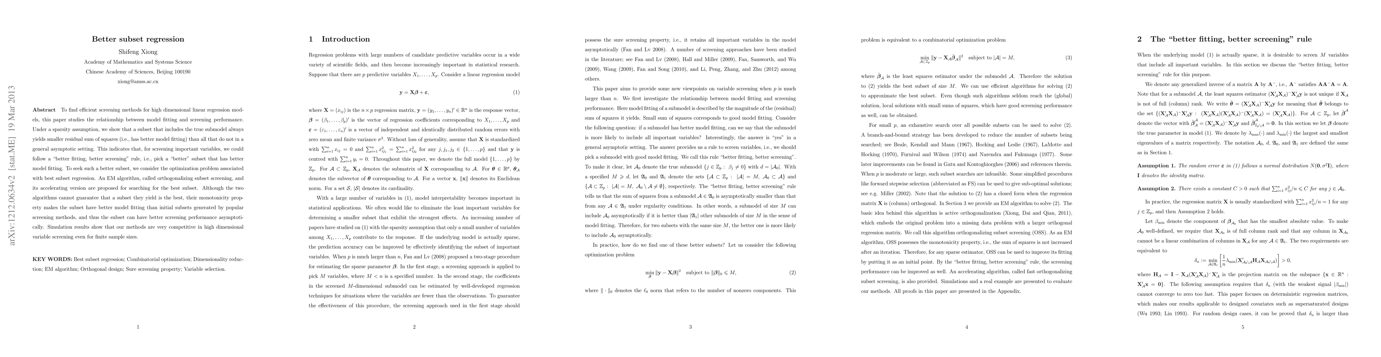 To find efficient screening methods for high dimensional linear regression models, this paper studies the relationship between model fitting and screening performance. Under a sparsity assumption, we show that a subset that includes the true submodel always yields smaller residual sum of squares (i.e., has better model fitting) than all that do not in a general asymptotic setting. This indicates that, for screening important variables, we could follow a "better fitting, better screening" rule, i.e., pick a "better" subset that has better model fitting. To seek such a better subset, we consider the optimization problem associated with best subset regression. An EM algorithm, called orthogonalizing subset screening, and its accelerating version are proposed for searching for the best subset. Although the two algorithms cannot guarantee that a subset they yield is the best, their monotonicity property makes the subset have better model fitting than initial subsets generated by popular screening methods, and thus the subset can have better screening performance asymptotically. Simulation results show that our methods are very competitive in high dimensional variable screening even for finite sample sizes.
