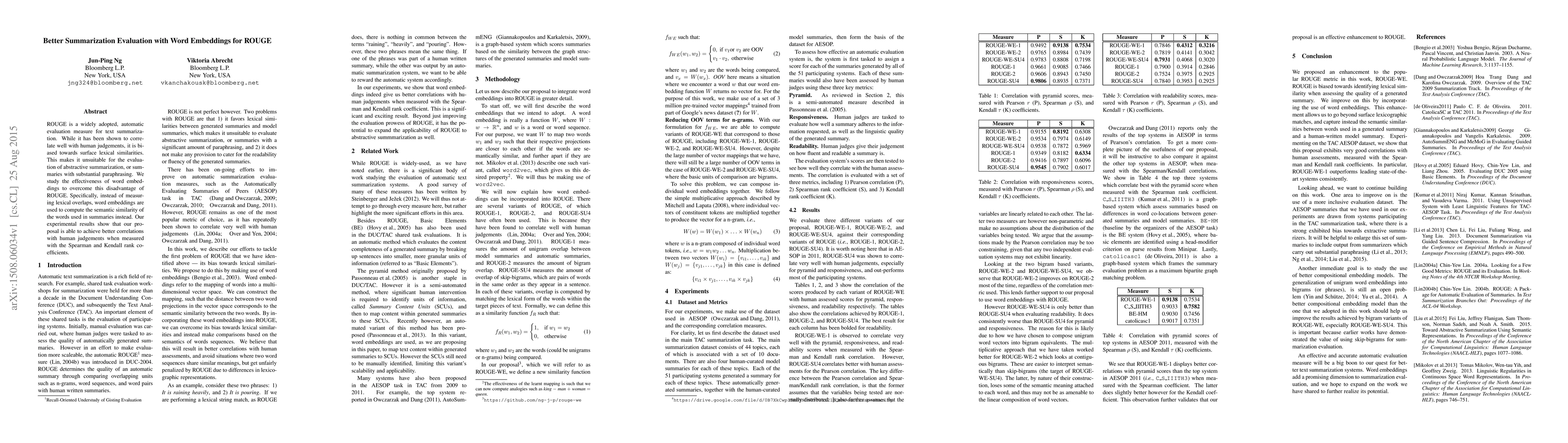 This paper proposes using word embeddings to improve ROUGE's evaluation of text summarization by measuring semantic similarity instead of lexical overlaps, achieving better correlation with human judgments. Experimental results show improved performance using Spearman and Kendall rank coefficients.