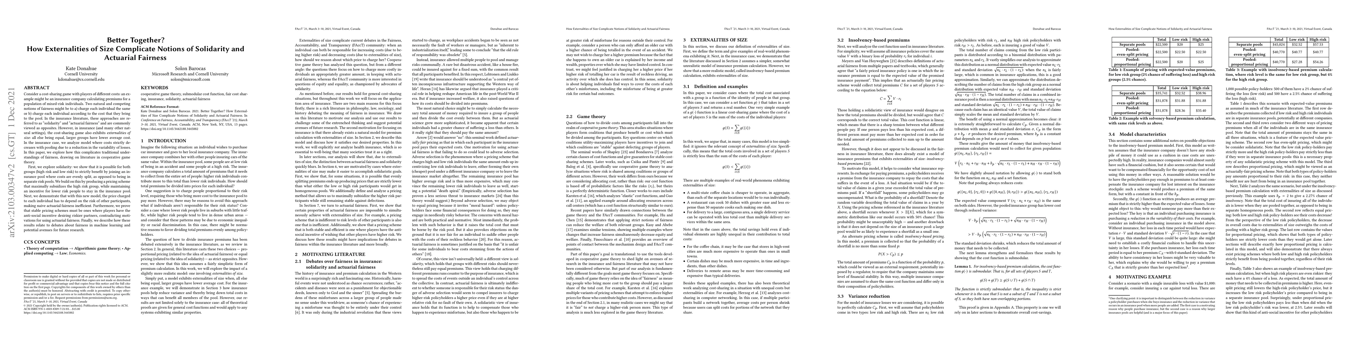 Consider a cost-sharing game with players of different contribution to the total cost: an example might be an insurance company calculating premiums for a population of mixed-risk individuals. Two natural and competing notions of fairness might be to a) charge each individual the same price or b) charge each individual according to the cost that they bring to the pool. In the insurance literature, these general approaches are referred to as "solidarity" and "actuarial fairness" and are commonly viewed as opposites. However, in insurance (and many other natural settings), the cost-sharing game also exhibits "externalities of size": all else being equal, larger groups have lower average cost. In the insurance case, we analyze a model with externalities of size due to a reduction in the variability of losses. We explore how this complicates traditional understandings of fairness, drawing on literature in cooperative game theory. First, we explore solidarity: we show that it is possible for both groups (high and low risk) to strictly benefit by joining an insurance pool where costs are evenly split, as opposed to being in separate risk pools. We build on this by producing a pricing scheme that maximally subsidizes the high risk group, while maintaining an incentive for lower risk people to stay in the insurance pool. Next, we demonstrate that with this new model, the price charged to each individual has to depend on the risk of other participants, making naive actuarial fairness inefficient. Furthermore, we prove that stable pricing schemes must be ones where players have the anti-social incentive of desiring riskier partners, contradicting motivations for using actuarial fairness. Finally, we describe how these results relate to debates about fairness in machine learning and potential avenues for future research.