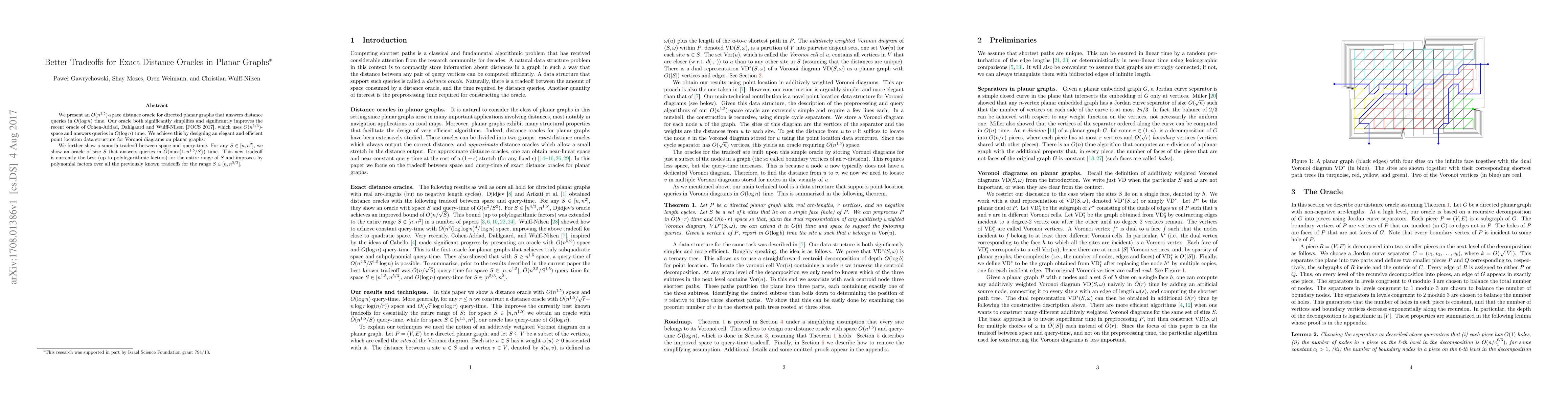 We present an $O(n^{1.5})$-space distance oracle for directed planar graphs that answers distance queries in $O(\log n)$ time. Our oracle both significantly simplifies and significantly improves the recent oracle of Cohen-Addad, Dahlgaard and Wulff-Nilsen [FOCS 2017], which uses $O(n^{5/3})$-space and answers queries in $O(\log n)$ time. We achieve this by designing an elegant and efficient point location data structure for Voronoi diagrams on planar graphs. We further show a smooth tradeoff between space and query-time. For any $S\in [n,n^2]$, we show an oracle of size $S$ that answers queries in $\tilde O(\max\{1,n^{1.5}/S\})$ time. This new tradeoff is currently the best (up to polylogarithmic factors) for the entire range of $S$ and improves by polynomial factors over all the previously known tradeoffs for the range $S \in [n,n^{5/3}]$.