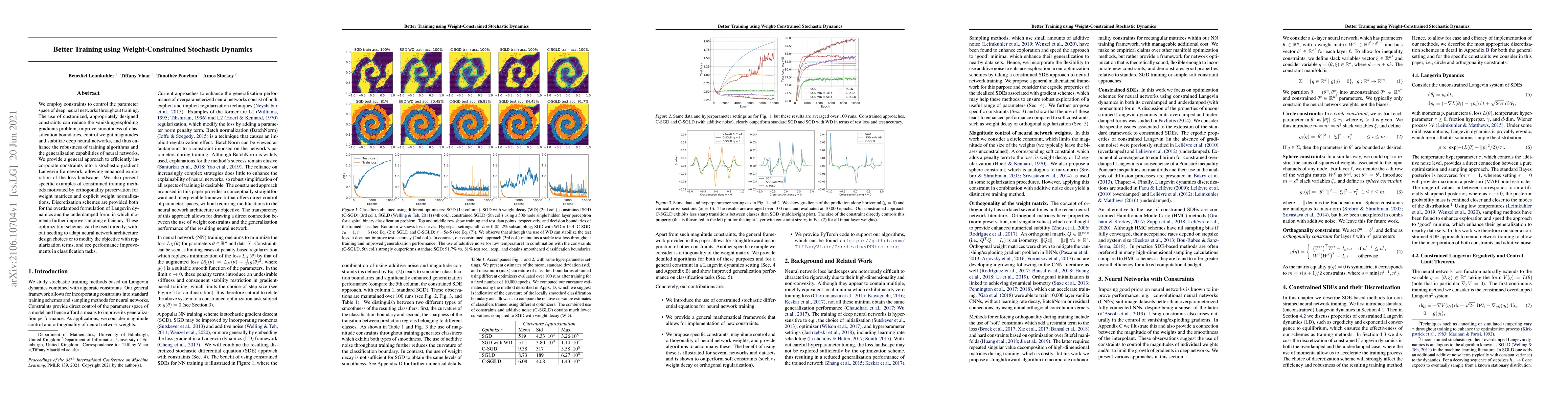 We employ constraints to control the parameter space of deep neural networks throughout training. The use of customized, appropriately designed constraints can reduce the vanishing/exploding gradients problem, improve smoothness of classification boundaries, control weight magnitudes and stabilize deep neural networks, and thus enhance the robustness of training algorithms and the generalization capabilities of neural networks. We provide a general approach to efficiently incorporate constraints into a stochastic gradient Langevin framework, allowing enhanced exploration of the loss landscape. We also present specific examples of constrained training methods motivated by orthogonality preservation for weight matrices and explicit weight normalizations. Discretization schemes are provided both for the overdamped formulation of Langevin dynamics and the underdamped form, in which momenta further improve sampling efficiency. These optimization schemes can be used directly, without needing to adapt neural network architecture design choices or to modify the objective with regularization terms, and see performance improvements in classification tasks.