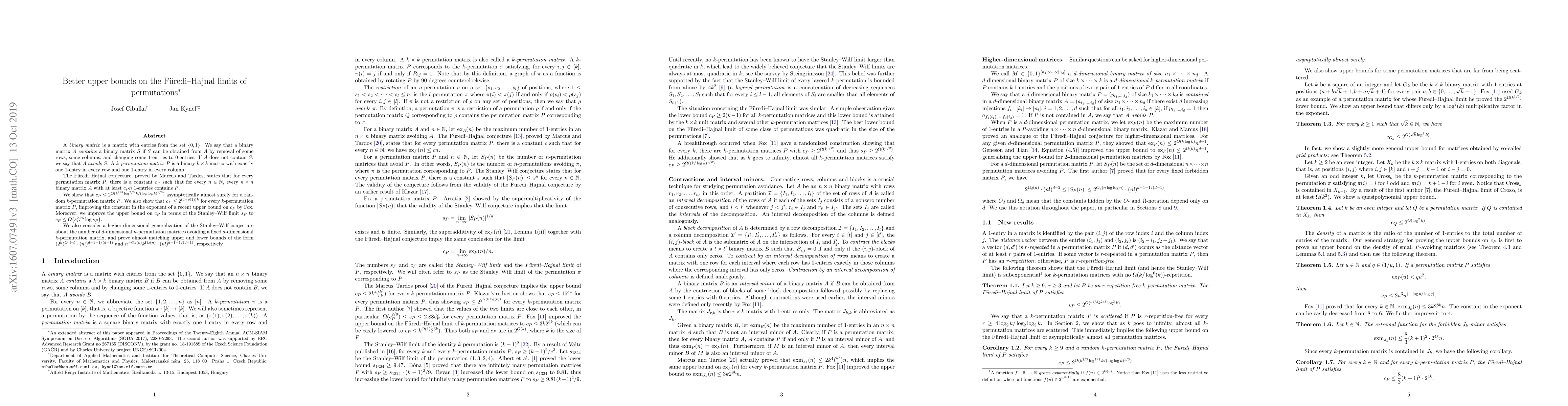 A binary matrix is a matrix with entries from the set $\{0,1\}$. We say that a binary matrix $A$ contains a binary matrix $S$ if $S$ can be obtained from $A$ by removal of some rows, some columns, and changing some $1$-entries to $0$-entries. If $A$ does not contain $S$, we say that $A$ avoids $S$. A $k$-permutation matrix $P$ is a binary $k \times k$ matrix with exactly one $1$-entry in every row and one $1$-entry in every column. The F\"uredi-Hajnal conjecture, proved by Marcus and Tardos, states that for every permutation matrix $P$, there is a constant $c_P$ such that for every $n \in \mathbb{N}$, every $n \times n$ binary matrix $A$ with at least $c_P n$ $1$-entries contains $P$. We show that $c_P \le 2^{O(k^{2/3}\log^{7/3}k / (\log\log k)^{1/3})}$ asymptotically almost surely for a random $k$-permutation matrix $P$. We also show that $c_P \le 2^{(4+o(1))k}$ for every $k$-permutation matrix $P$, improving the constant in the exponent of a recent upper bound on $c_P$ by Fox. Moreover, we improve the upper bound on $c_P$ in terms of the Stanley-Wilf limit $s_P$ to $c_P \le O\big(s_P^{2.75} \log s_P\big)$. We also consider a higher-dimensional generalization of the Stanley-Wilf conjecture about the number of $d$-dimensional $n$-permutation matrices avoiding a fixed $d$-dimensional $k$-permutation matrix, and prove almost matching upper and lower bounds of the form $(2^k)^{O(n)} \cdot (n!)^{d-1-1/(d-1)}$ and $n^{-O(k)} k^{\Omega(n)} \cdot (n!)^{d-1-1/(d-1)}$, respectively.