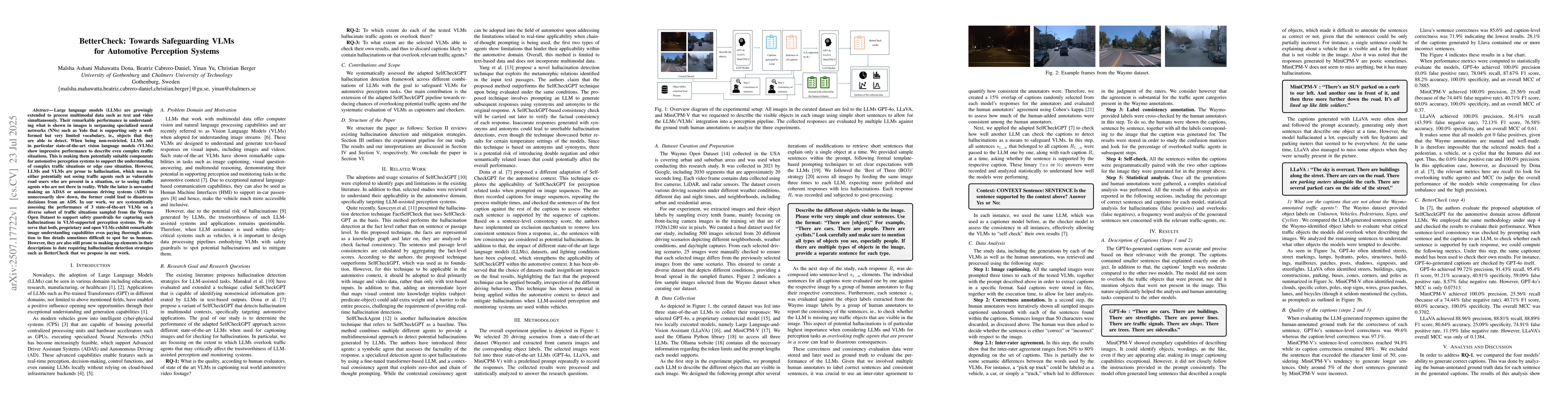 Large language models (LLMs) are growingly extended to process multimodal data such as text and video simultaneously. Their remarkable performance in understanding what is shown in images is surpassing specialized neural networks (NNs) such as Yolo that is supporting only a well-formed but very limited vocabulary, ie., objects that they are able to detect. When being non-restricted, LLMs and in particular state-of-the-art vision language models (VLMs) show impressive performance to describe even complex traffic situations. This is making them potentially suitable components for automotive perception systems to support the understanding of complex traffic situations or edge case situation. However, LLMs and VLMs are prone to hallucination, which mean to either potentially not seeing traffic agents such as vulnerable road users who are present in a situation, or to seeing traffic agents who are not there in reality. While the latter is unwanted making an ADAS or autonomous driving systems (ADS) to unnecessarily slow down, the former could lead to disastrous decisions from an ADS. In our work, we are systematically assessing the performance of 3 state-of-the-art VLMs on a diverse subset of traffic situations sampled from the Waymo Open Dataset to support safety guardrails for capturing such hallucinations in VLM-supported perception systems. We observe that both, proprietary and open VLMs exhibit remarkable image understanding capabilities even paying thorough attention to fine details sometimes difficult to spot for us humans. However, they are also still prone to making up elements in their descriptions to date requiring hallucination detection strategies such as BetterCheck that we propose in our work.