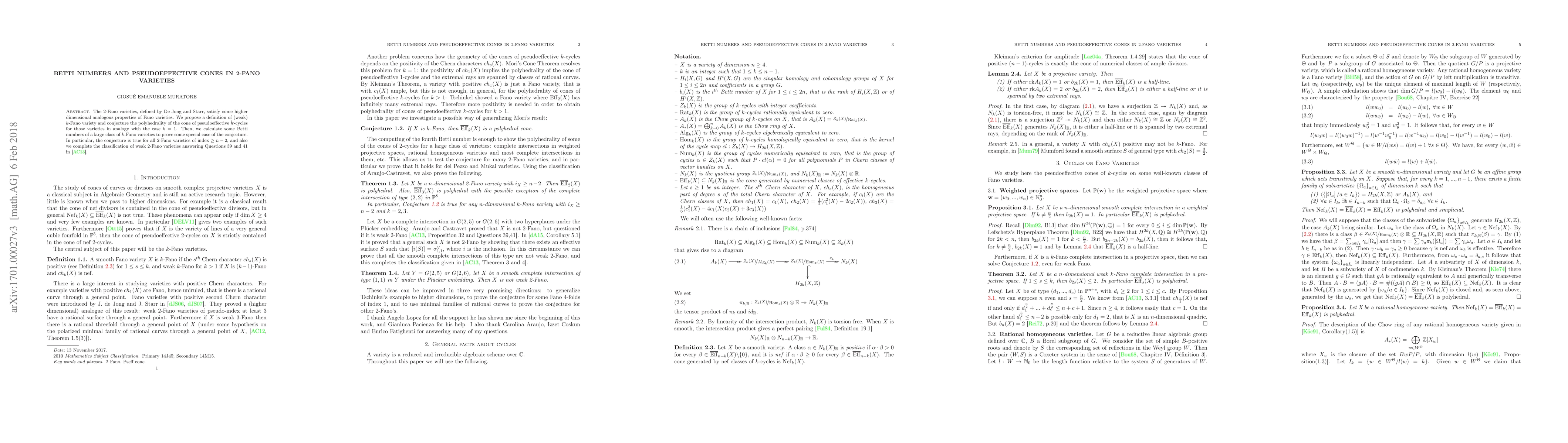 The 2-Fano varieties, defined by De Jong and Starr, satisfy some higher dimensional analogous properties of Fano varieties. We propose a definition of (weak) $k$-Fano variety and conjecture the polyhedrality of the cone of pseudoeffective $k$-cycles for those varieties in analogy with the case $k=1$. Then, we calculate some Betti numbers of a large class of $k$-Fano varieties to prove some special case of the conjecture. In particular, the conjecture is true for all 2-Fano varieties of index $\ge n-2$, and also we complete the classification of weak 2-Fano varieties of Araujo and Castravet.