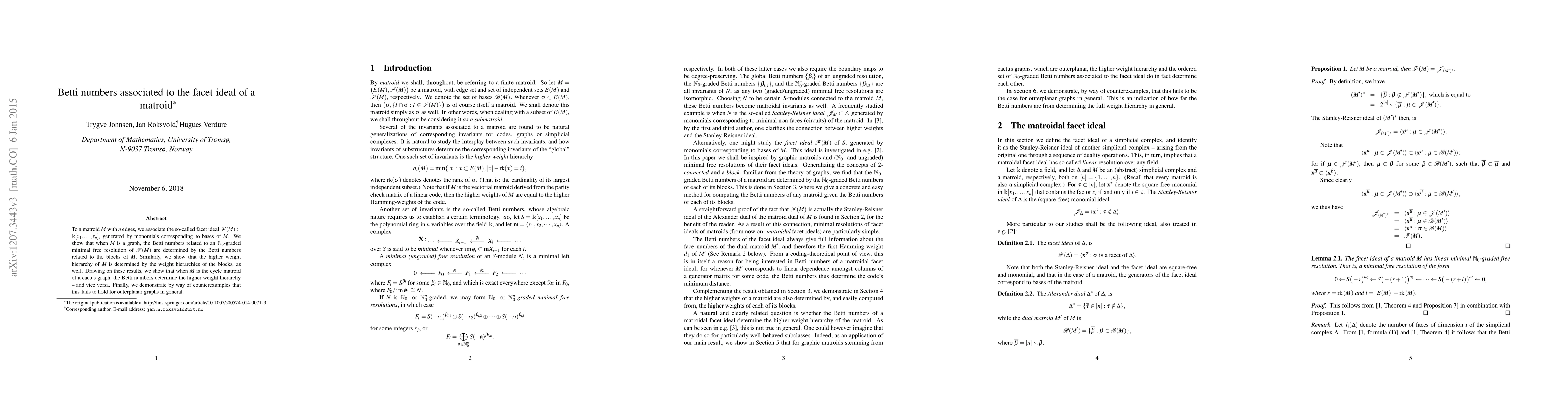 This paper investigates the Betti numbers associated with the facet ideal of a matroid, showing they are determined by the Betti numbers of its blocks. It further demonstrates that for cycle matroids of cactus graphs, Betti numbers dictate the higher weight hierarchy, a relationship not generally true for outerplanar graphs.