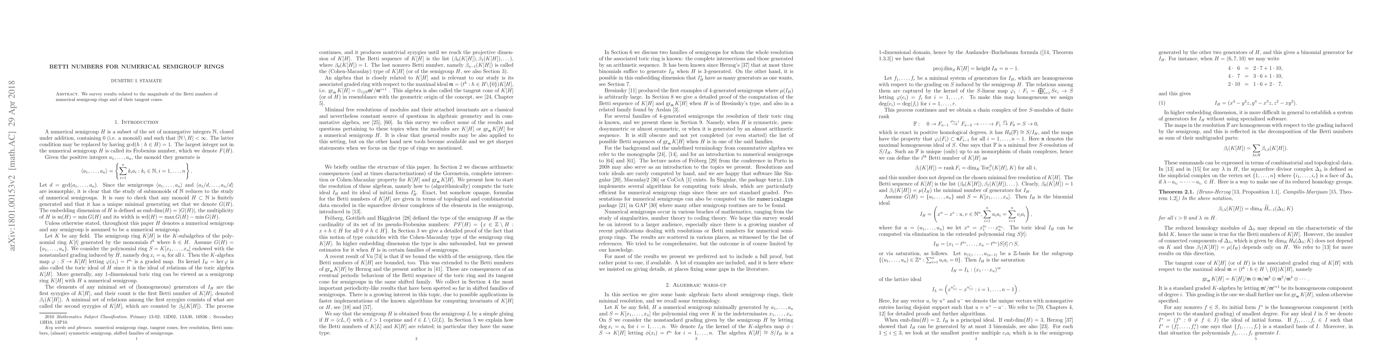 Summary: This paper reviews findings on the Betti numbers, which measure the complexity of the minimal free resolutions, for numerical semigroup rings and their tangent cones, providing insights into their algebraic structure.