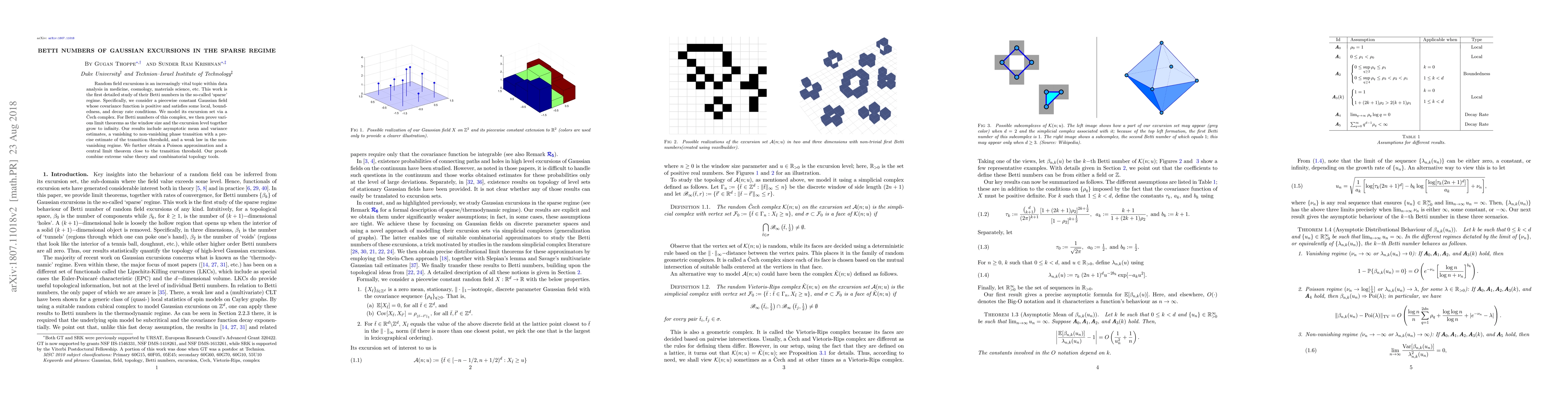 This paper studies the Betti numbers of Gaussian field excursions in the sparse regime, proving limit theorems including asymptotic mean and variance estimates, a phase transition, and a central limit theorem near the transition threshold. The analysis combines extreme value theory and combinatorial topology to model the excursion set via a Cech complex.