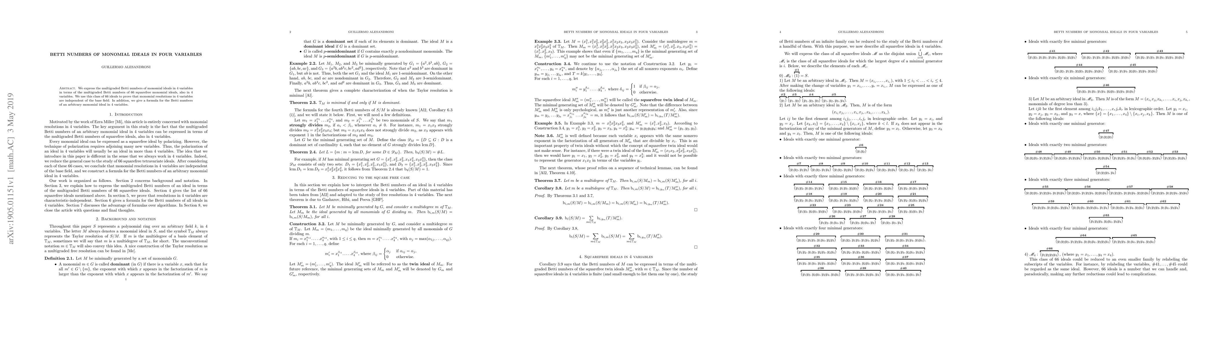 This paper expresses the multigraded Betti numbers of monomial ideals in four variables in terms of a specific set of 66 squarefree monomial ideals, demonstrating that monomial resolutions in this context are field-independent and provides a formula for Betti numbers of any monomial ideal in four variables.