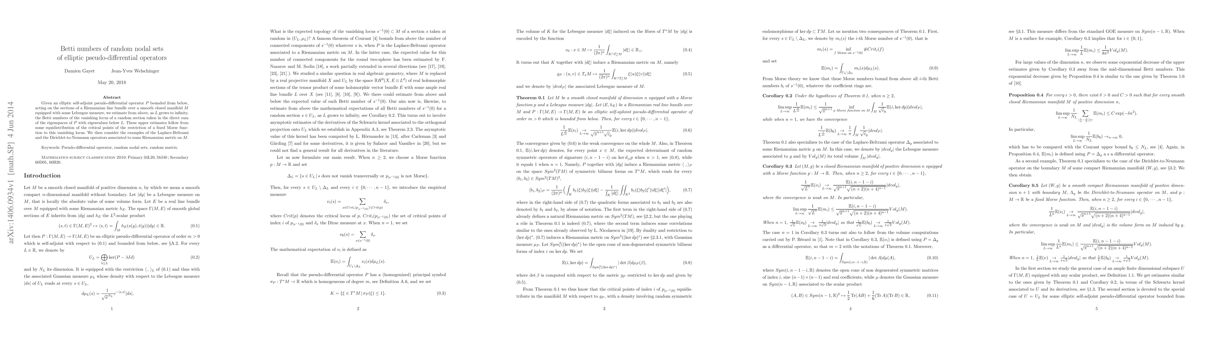 Given an elliptic self-adjoint pseudo-differential operator $P$ bounded from below, acting on the sections of a Riemannian line bundle over a smooth closed manifold $M$ equipped with some Lebesgue measure, we estimate from above, as $L$ grows to infinity, the Betti numbers of the vanishing locus of a random section taken in the direct sum of the eigenspaces of $P$ with eigenvalues below $L$. These upper estimates follow from some equidistribution of the critical points of the restriction of a fixed Morse function to this vanishing locus. We then consider the examples of the Laplace-Beltrami and the Dirichlet-to-Neumann operators associated to some Riemannian metric on $M$.