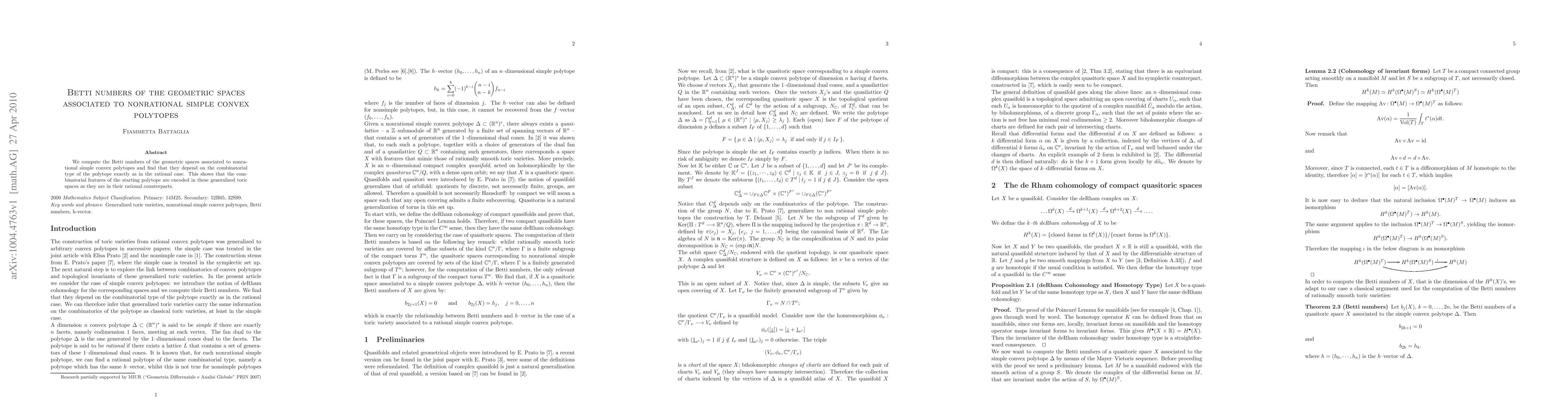Summary: The Betti numbers of geometric spaces linked to nonrational simple convex polytopes were calculated, revealing a dependency on the polytope's combinatorial structure similar to that of rational polytopes, thus demonstrating that combinatorial features are preserved in these generalized toric spaces.