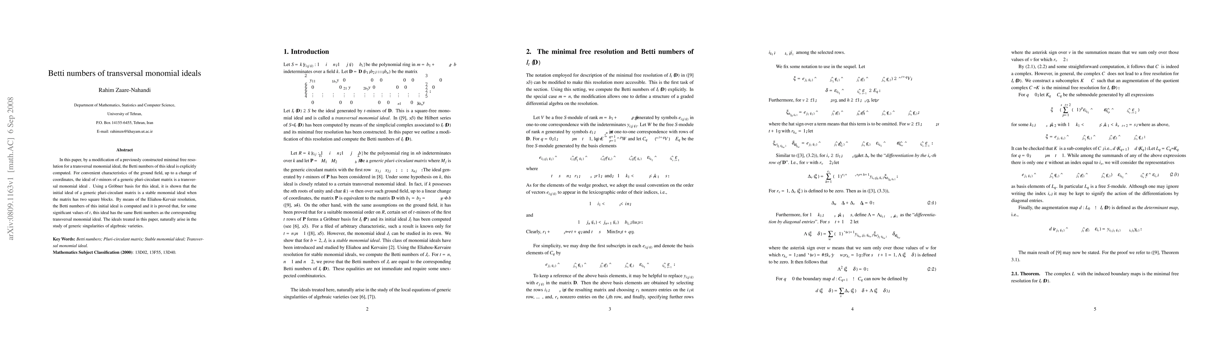 This paper computes the Betti numbers of transversal monomial ideals through a modified minimal free resolution. It demonstrates that the ideal of $t$-minors of a generic pluri-circulant matrix shares Betti numbers with the corresponding transversal monomial ideal, proving that the initial ideal is stable under certain conditions.
