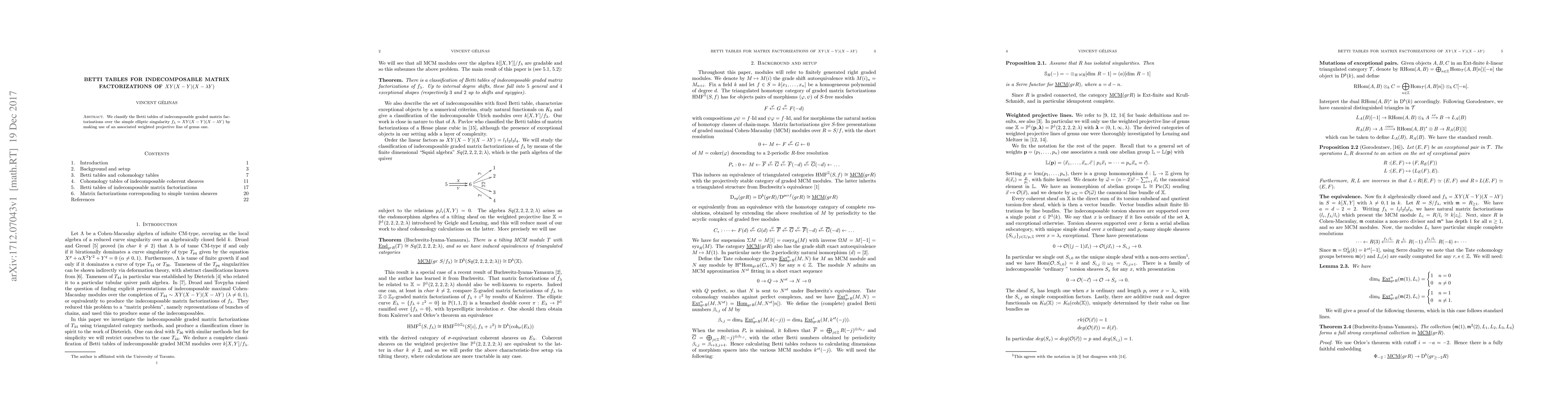 We classify the Betti tables of indecomposable graded matrix factorizations over the simple elliptic singularity $f_\lambda = XY(X-Y)(X-\lambda Y)$ by making use of an associated weighted projective line of genus one.