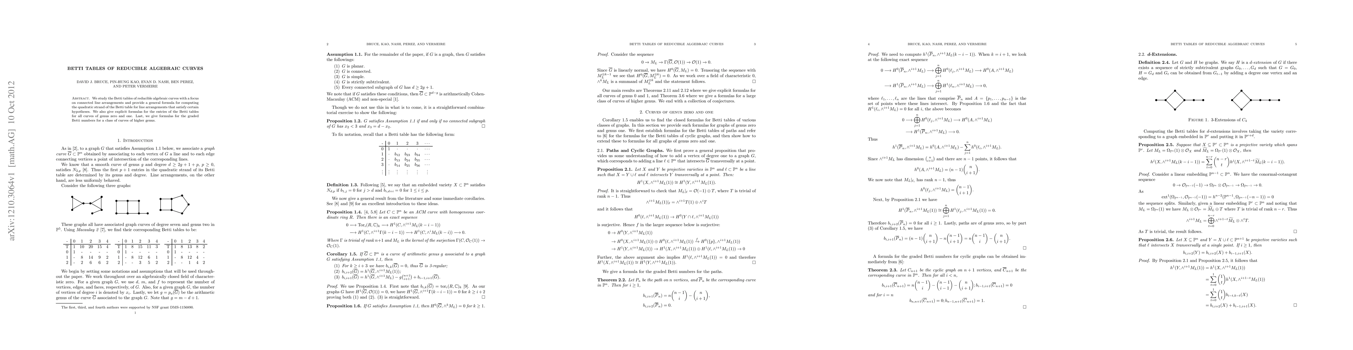This paper investigates Betti tables for reducible algebraic curves, particularly connected line arrangements, providing a general formula for the quadratic strand and explicit formulas for genus zero and one curves, along with graded Betti number formulas for higher genus curves.