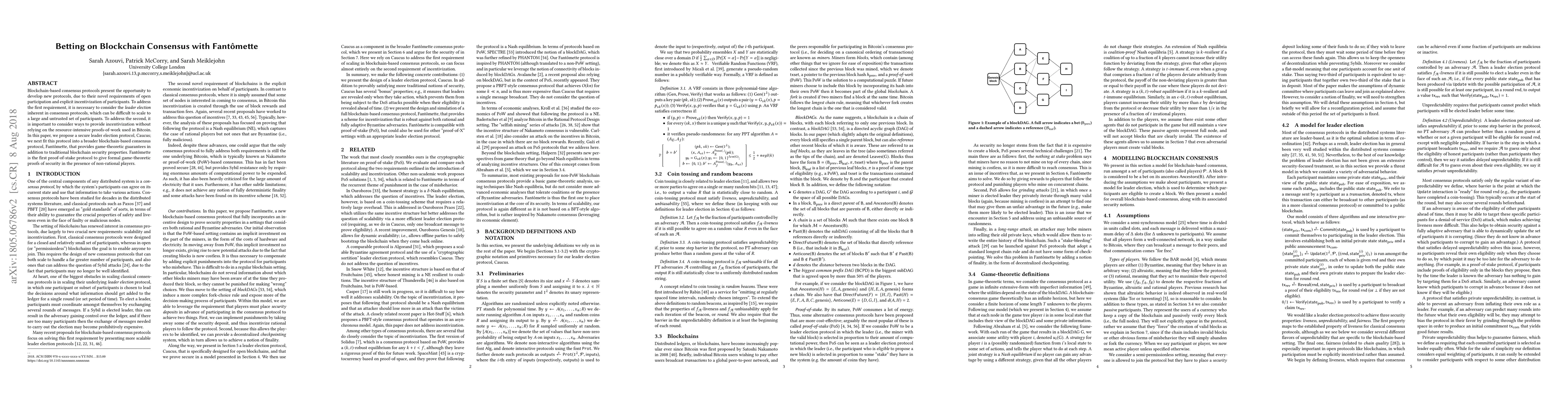 Blockchain-based consensus protocols present the opportunity to develop new protocols, due to their novel requirements of open participation and explicit incentivization of participants. To address the first requirement, it is necessary to consider the leader election inherent in consensus protocols, which can be difficult to scale to a large and untrusted set of participants. To address the second, it is important to consider ways to provide incentivization without relying on the resource-intensive proofs-of-work used in Bitcoin. In this paper, we propose a secure leader election protocol, Caucus; we next fit this protocol into a broader blockchain-based consensus protocol, Fantomette, that provides game-theoretic guarantees in addition to traditional blockchain security properties. Fantomette is the first proof-of-stake protocol to give formal game-theoretic proofs of security in the presence of non-rational players.