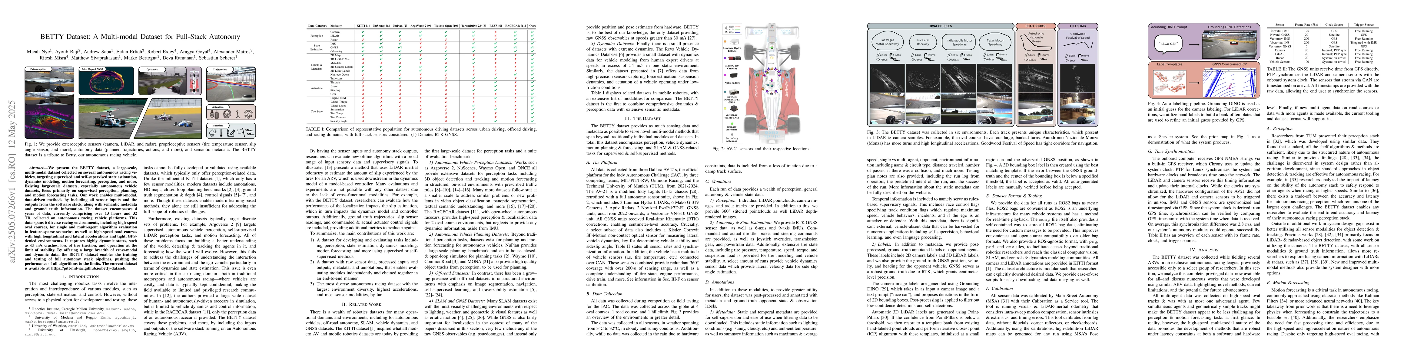 BETTY dataset, a comprehensive multi-modal dataset for full-stack autonomy research, including sensor data, software stack outputs, and metadata.