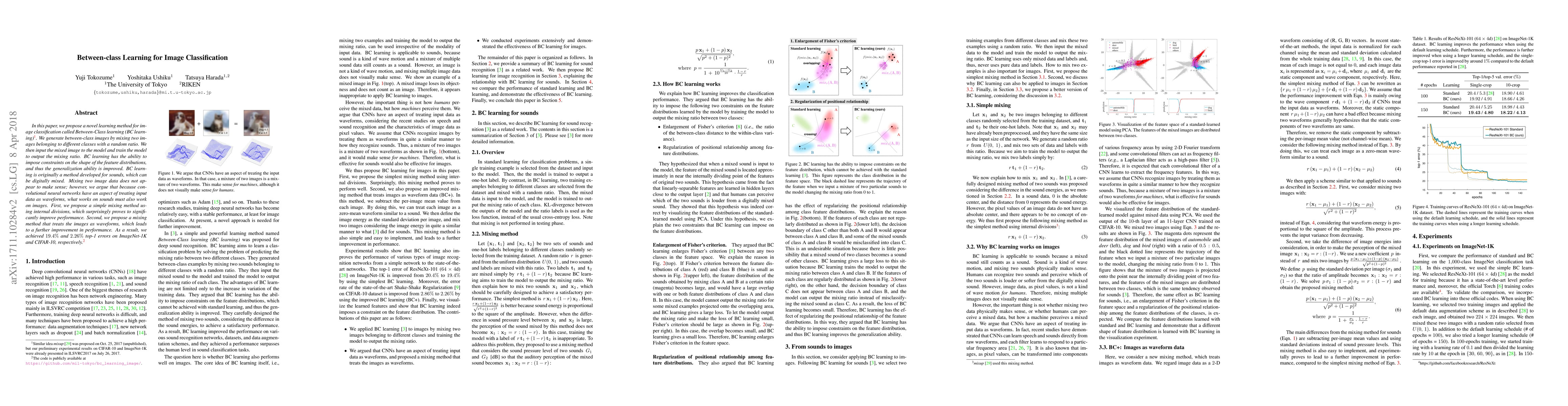This paper introduces Between-Class (BC) learning for image classification, a method adapted from sound mixing. By blending images from different classes and training models to predict the blend ratio, BC learning enhances feature distribution and generalization. Two mixing methods are proposed, improving performance on ImageNet-1K and CIFAR-10 datasets.