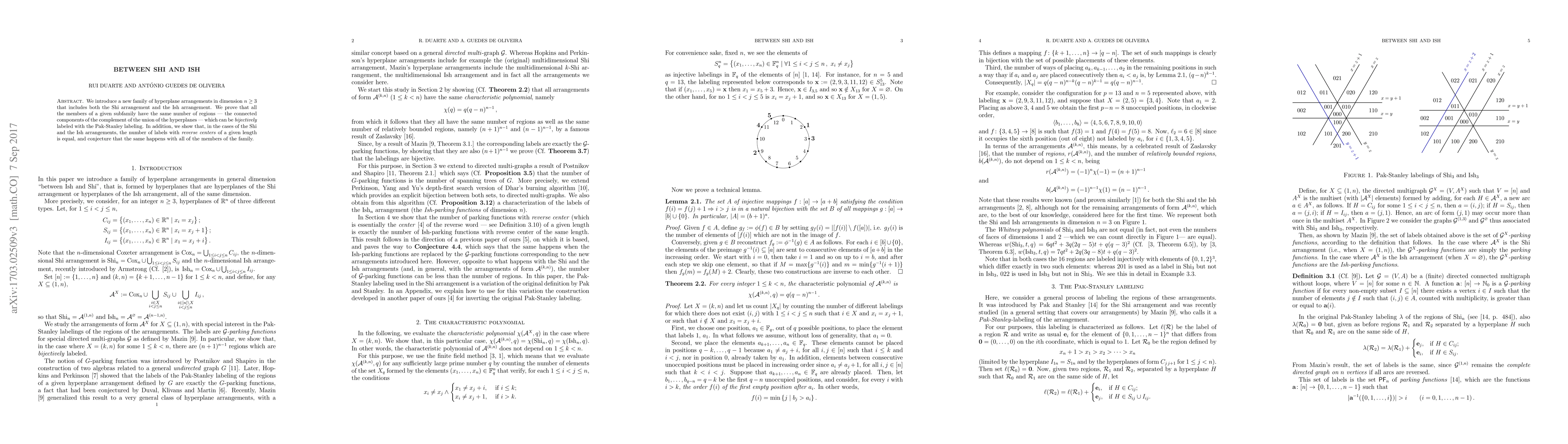 We introduce a new family of hyperplane arrangements in dimension $n\geq3$ that includes both the Shi arrangement and the Ish arrangement. We prove that all the members of a given subfamily have the same number of regions - the connected components of the complement of the union of the hyperplanes - which can be bijectively labeled with the Pak-Stanley labeling. In addition, we show that, in the cases of the Shi and the Ish arrangements, the number of labels with reverse centers of a given length is equal, and conjecture that the same happens with all of the members of the family.