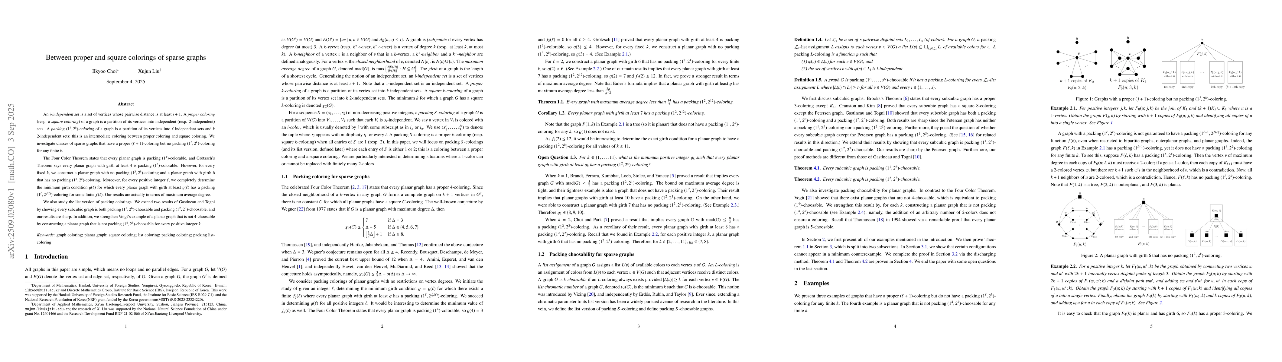 An $i$-independent set is a set of vertices whose pairwise distance is at least $i+1$. A proper coloring (resp. a square coloring) of a graph is a partition of its vertices into independent (resp. $2$-independent) sets. A packing $(1^{\ell},2^k)$-coloring of a graph is a partition of its vertices into $\ell$ independent sets and $k$ $2$-independent sets; this is an intermediate coloring between proper coloring and square coloring. We investigate classes of sparse graphs that have a proper $(\ell+1)$-coloring but no packing $(1^{\ell},2^k)$-coloring for any finite $k$. The Four Color Theorem states that every planar graph is packing $(1^4)$-colorable, and Gr\"otzsch's Theorem says every planar graph with girth at least $4$ is packing $(1^3)$-colorable. However, for every fixed $k$, we construct a planar graph with no packing $(1^{3},2^k)$-coloring and a planar graph with girth $6$ that has no packing $(1^{2},2^k)$-coloring. Moreover, for every positive integer $\ell$, we completely determine the minimum girth condition $g(\ell)$ for which every planar graph with girth at least $g(\ell)$ has a packing $(1^{\ell},2^{f(\ell)})$-coloring for some finite $f(\ell)$. Our results are actually in terms of maximum average degree. We also study the list version of packing colorings. We extend two results of Gastineau and Togni by showing every subcubic graph is both packing $(1^{1},2^6)$-choosable and packing $(1^{2},2^3)$-choosable, and our results are sharp. In addition, we strengthen Voigt's example of a planar graph that is not $4$-choosable by constructing a planar graph that is not packing $(1^{4},2^k)$-choosable for every positive integer $k$.