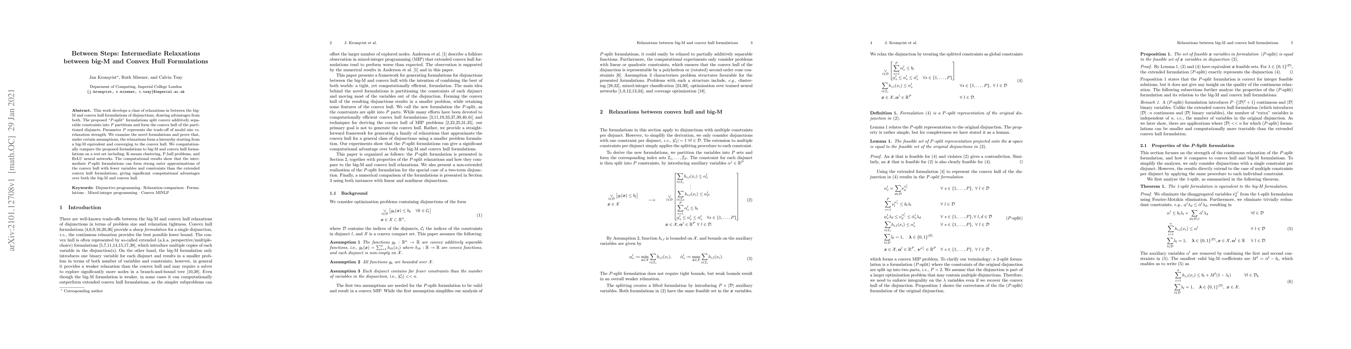 This paper introduces "P-split" formulations as intermediate relaxations between big-M and convex hull approaches for disjunctions, showing that they provide a balance between model size and relaxation strength. Computational tests on K-means clustering, P_ball problems, and ReLU neural networks demonstrate that P-split formulations offer strong approximations with fewer variables and constraints, outperforming both big-M and convex hull formulations.