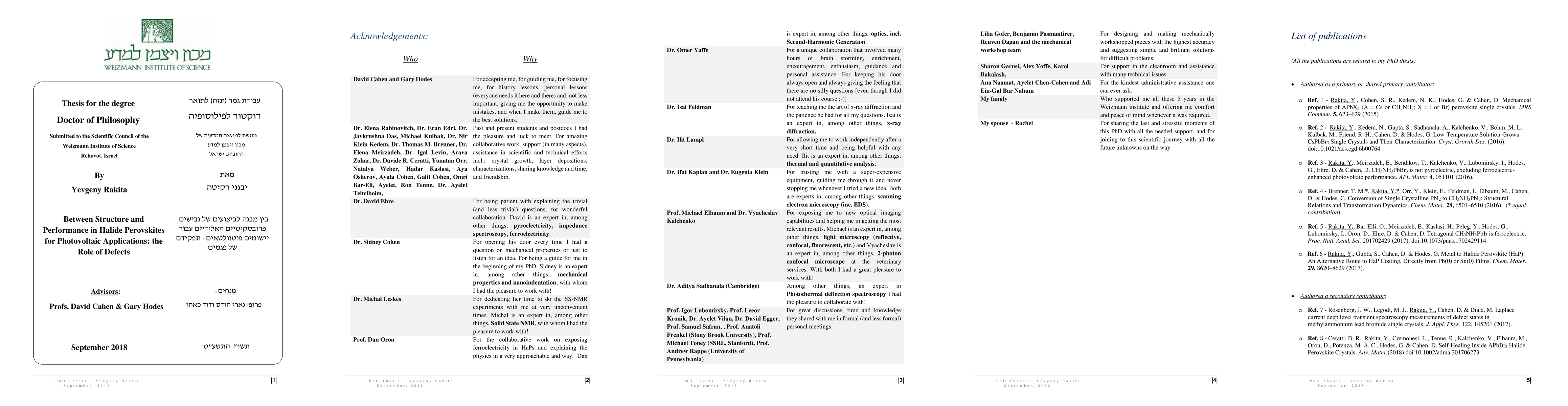 My study is about Halide Perovskites (HaPs) and focuses the fundamental structural, chemical and dielectric properties of HaPs in reference to their PV-related properties. * I present my main research model: HaP single-crystals - their growth and characterization; * I start by exploring the bond nature of HaPs using Nanoindentation and Solid-State NMR techniques. * I explore the 'deformation potential' of the structure and show that its low and positive value in HaPs strongly suggests a pronounced 'defect tolerance'. * I explore the scattering mechanism of charges in the soft and highly polarizable system such as HaPs, and show that its low mobility (relative to other heteropolar systems) is fundamental and cannot be improved. I also show that a positive 'deformation potential' (so the valence band is 'anti-bonding', where a system should promote 'defect-tolerance') is something that is common to other highly polarizable systems, such as AgX, and Pb-chalcogenides. * I explore the chemistry of the system and show that HaPs can easily break to constituents, but also easily be made by the same constituents, suggesting a low activation energy for annealing process to take care even at RT. This RT annealing can promote 'self-healing' at ~second to ~minute time-scale, which we clearly observe. We find 'entropic-stabilization' to be very important in 'self-healing' processes of that kind. * I explore the importance of symmetry breaking in the HaP structure, which can induce a polar - and thus Ferroelectric - structure. We conclude that Ferroelectricity is not a fundamental property of HaPs, since it doesn't exist in MAPbBr3, but only in MAPbI3 - as proven unambiguously - and what is present in MAPbI3 is in doubt important for photovoltaics, when using them at RT or above. Due to compression, if you find a low-quality figure you want- please email me.