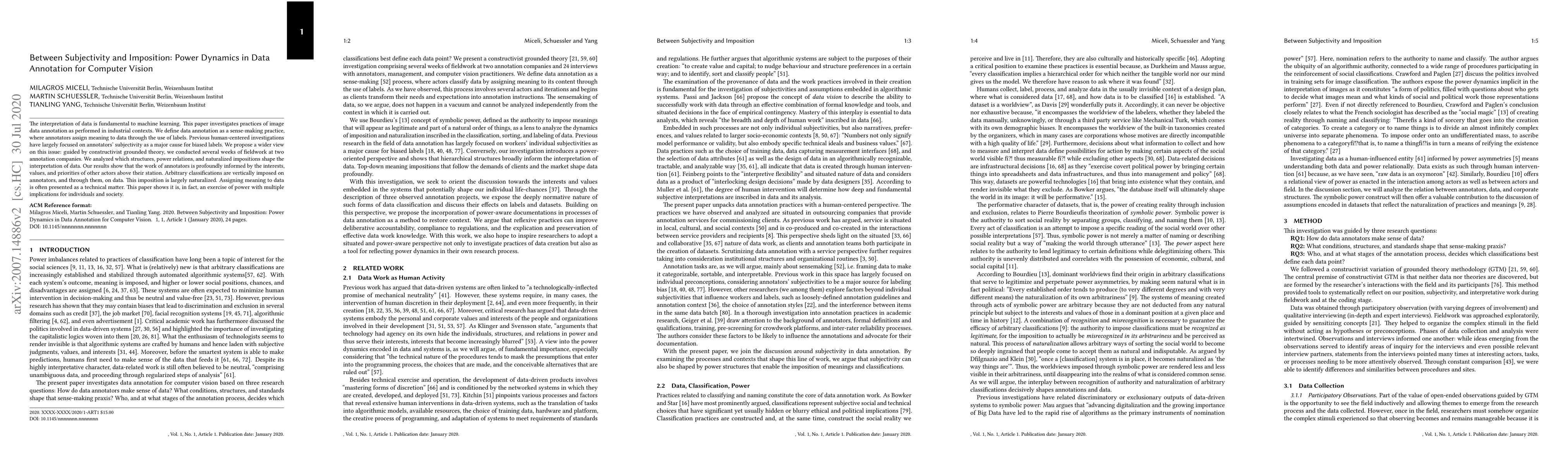 The interpretation of data is fundamental to machine learning. This paper investigates practices of image data annotation as performed in industrial contexts. We define data annotation as a sense-making practice, where annotators assign meaning to data through the use of labels. Previous human-centered investigations have largely focused on annotators subjectivity as a major cause for biased labels. We propose a wider view on this issue: guided by constructivist grounded theory, we conducted several weeks of fieldwork at two annotation companies. We analyzed which structures, power relations, and naturalized impositions shape the interpretation of data. Our results show that the work of annotators is profoundly informed by the interests, values, and priorities of other actors above their station. Arbitrary classifications are vertically imposed on annotators, and through them, on data. This imposition is largely naturalized. Assigning meaning to data is often presented as a technical matter. This paper shows it is, in fact, an exercise of power with multiple implications for individuals and society.