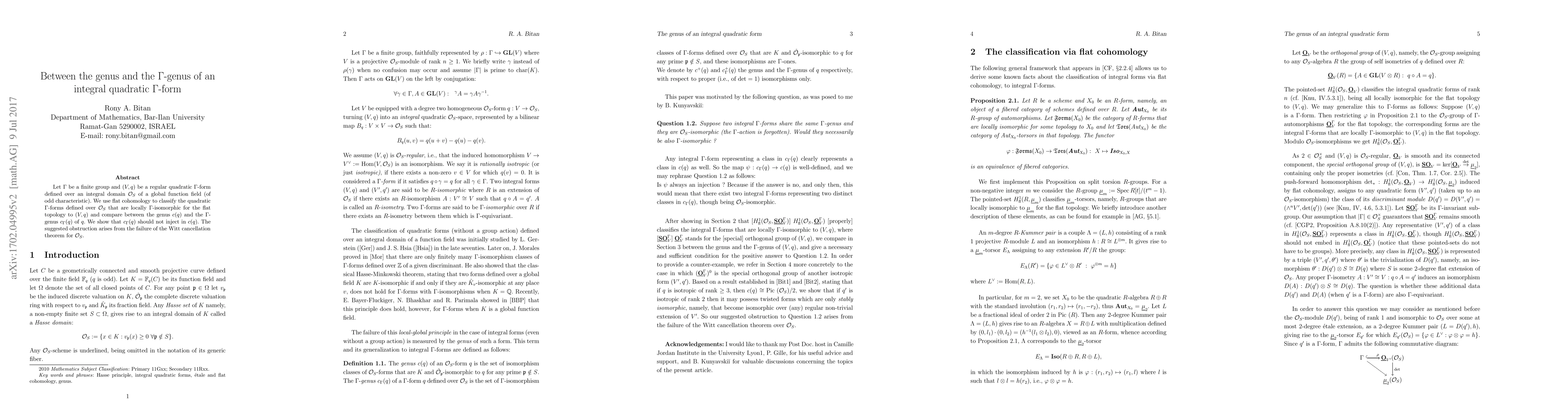 Let \Gamma be a finite group and (V,q) be a regular quadratic \Gamma-form defined over an integral domain $\mathcal{O}_S$ of a global function field (of odd characteristic). We use flat cohomology to classify the quadratic \Gamma-forms defined over $\mathcal{O}_S$ that are locally \Gamma-isomorphic for the flat topology to (V,q) and compare between the genus c(q) and the \Gamma-genus c_{\Gamma}(q) of q. We show that c_{\Gamma}(q) should not inject in c(q). The suggested obstruction arises from the failure of the Witt cancellation theorem for $\mathcal{O}_S$.