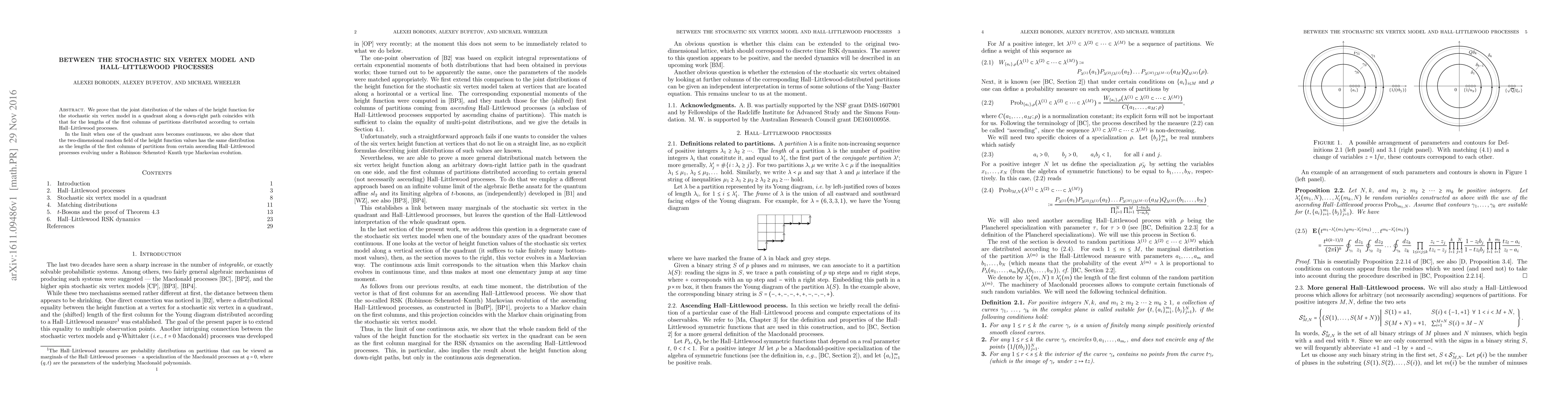 We prove that the joint distribution of the values of the height function for the stochastic six vertex model in a quadrant along a down-right path coincides with that for the lengths of the first columns of partitions distributed according to certain Hall-Littlewood processes. In the limit when one of the quadrant axes becomes continuous, we also show that the two-dimensional random field of the height function values has the same distribution as the lengths of the first columns of partitions from certain ascending Hall-Littlewood processes evolving under a Robinson-Schensted-Knuth type Markovian evolution.