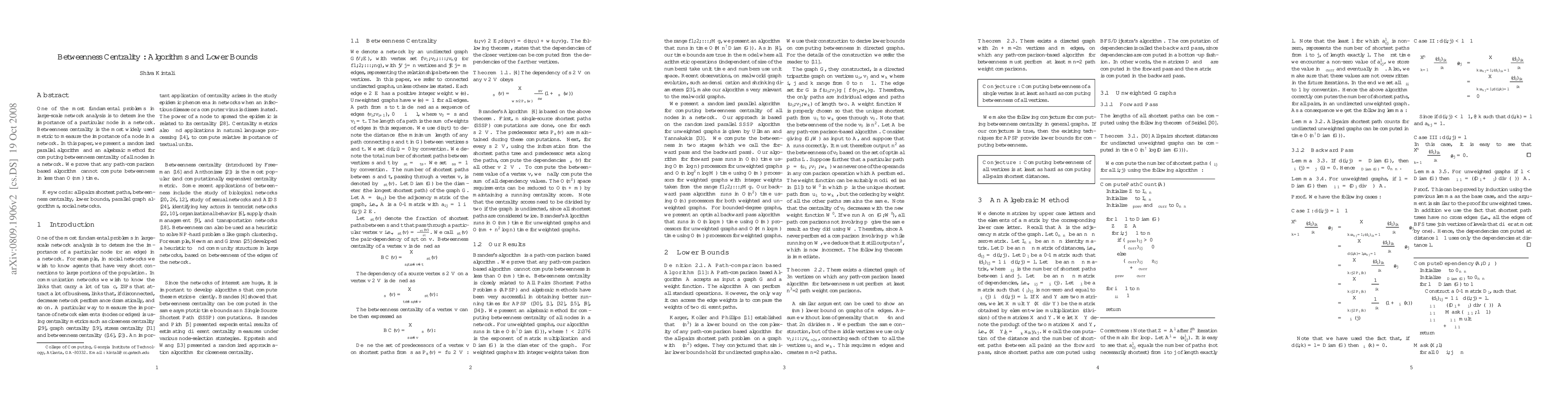 This paper introduces a randomized parallel algorithm and an algebraic method for computing betweenness centrality in large networks, and establishes a lower bound proving that any path-comparison based algorithm requires at least O(nm) time to compute betweenness centrality.