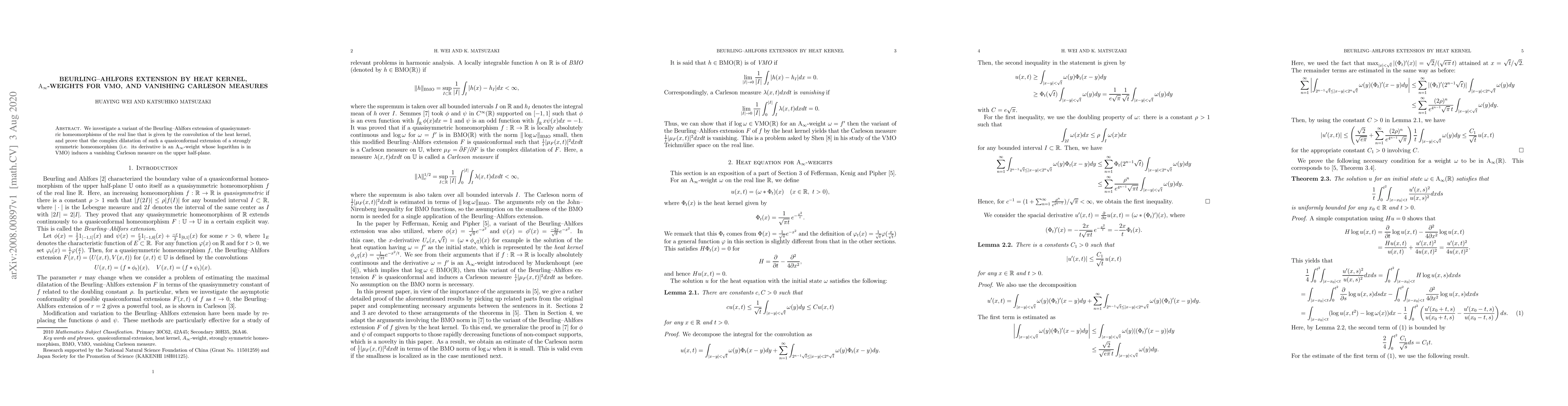 This paper explores a Beurling-Ahlfors extension using the convolution of the heat kernel for quasisymmetric homeomorphisms, proving that the complex dilatation of such extensions, when the derivative is an ${\rm A}_\infty$-weight in VMO, results in a vanishing Carleson measure on the upper half-plane.